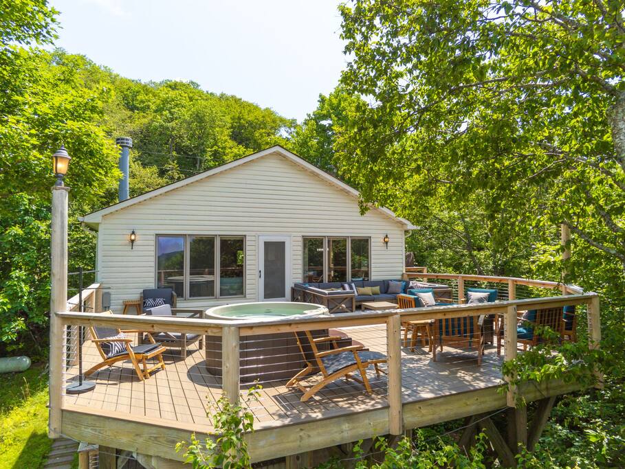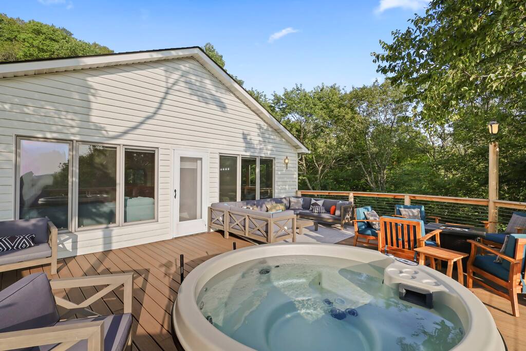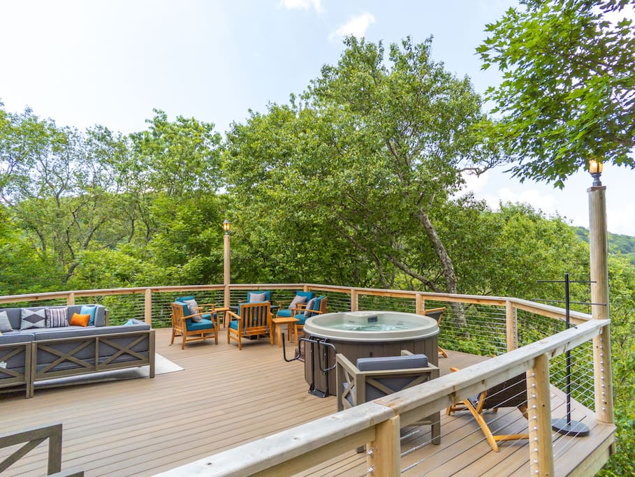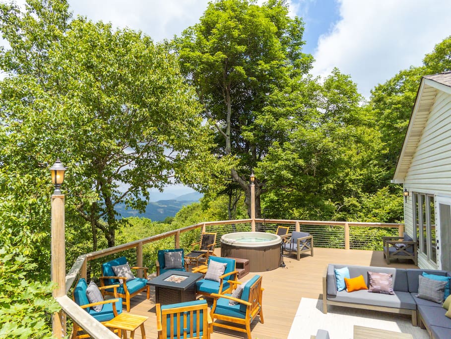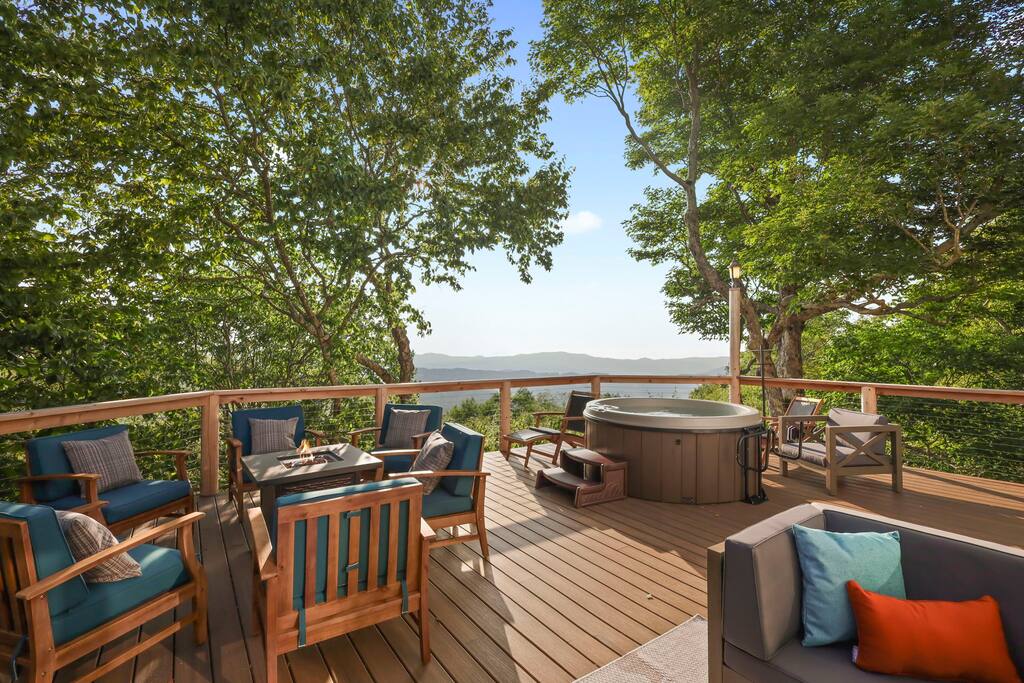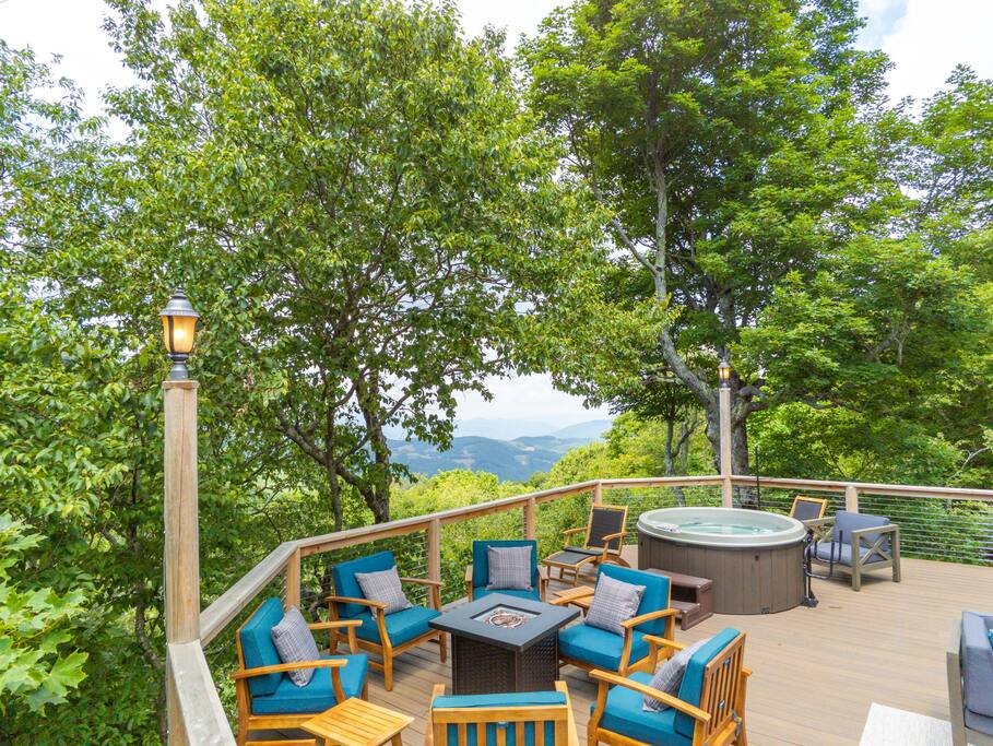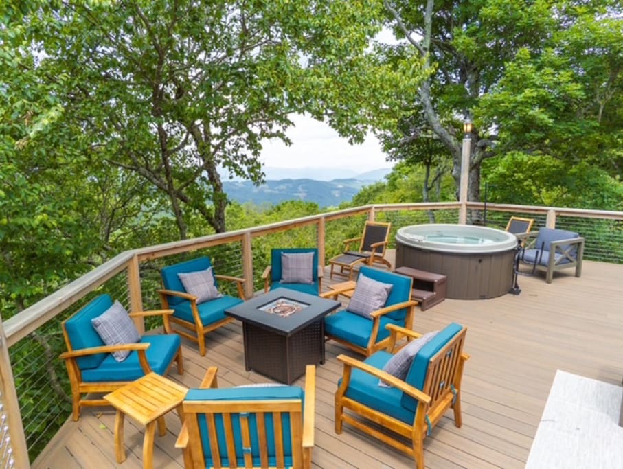 Expansive deck with cozy lounge seating, fire table, and bubbling hot tub overlooking stunning views.