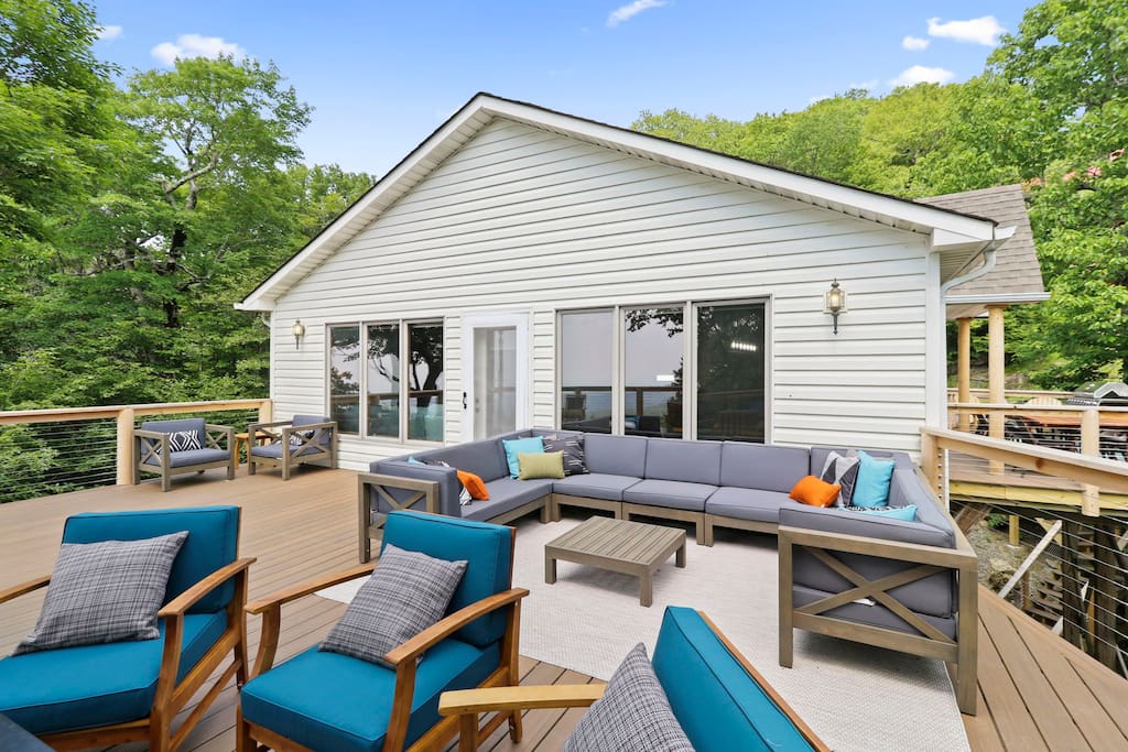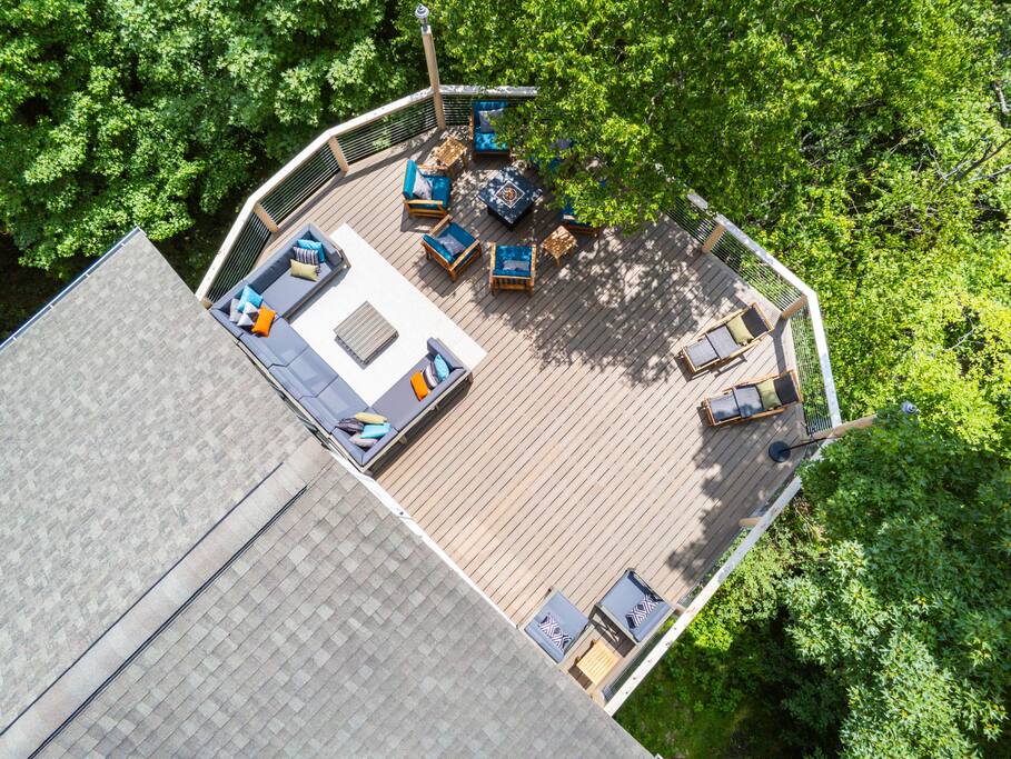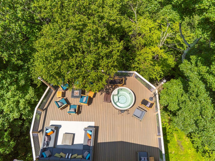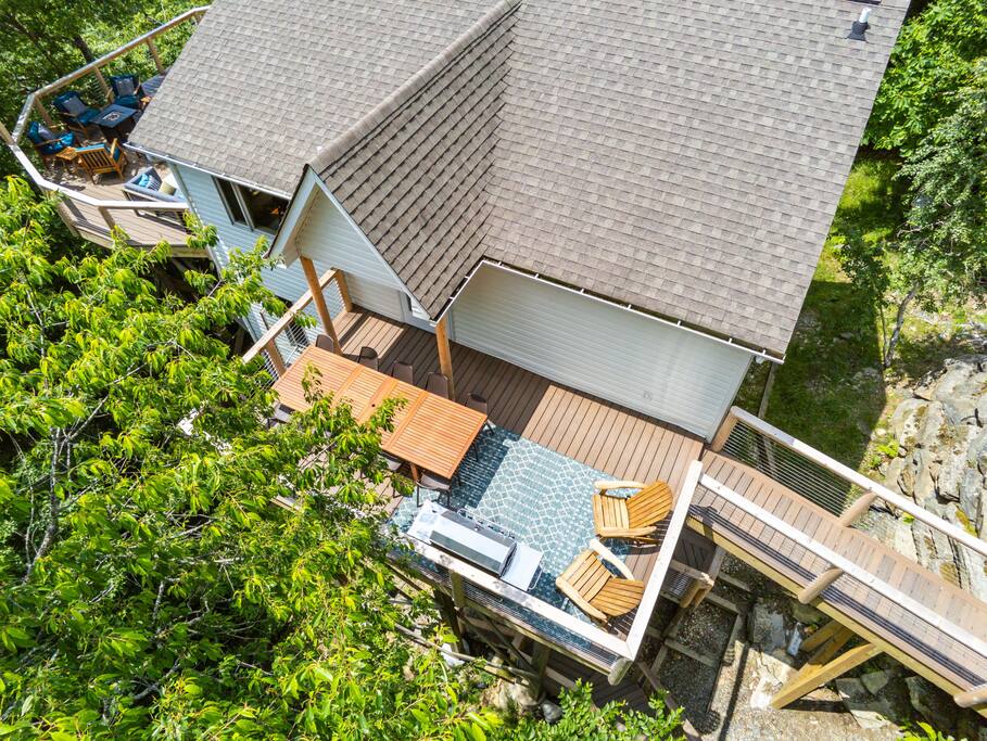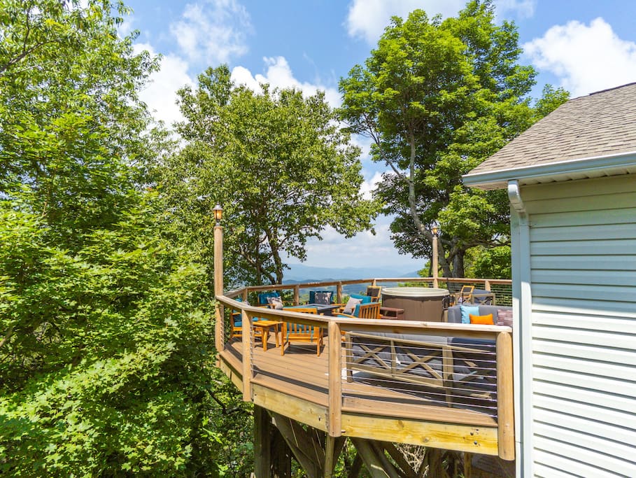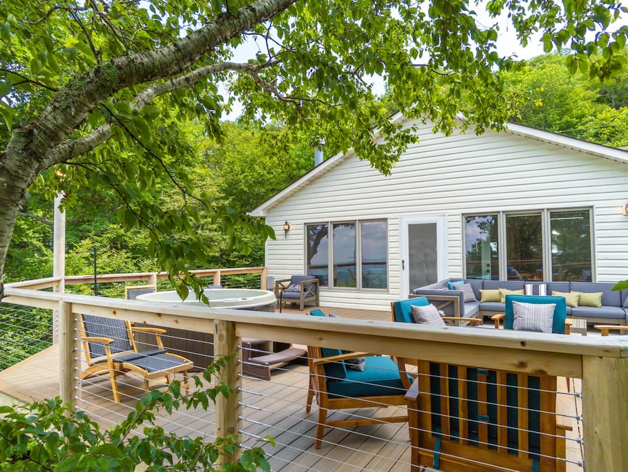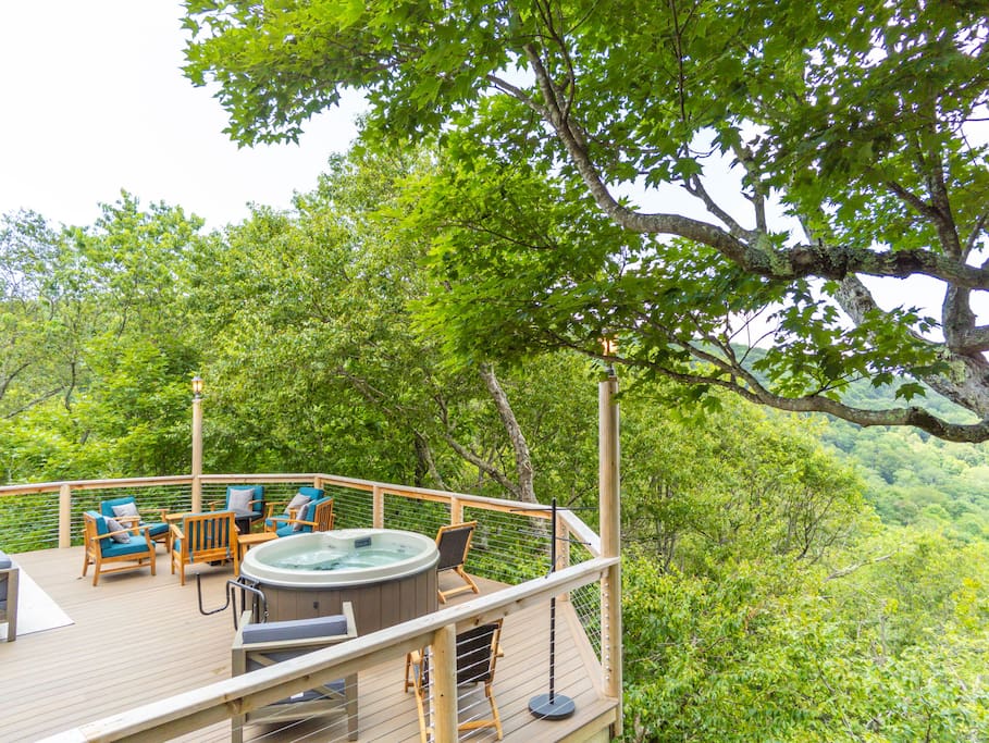 Expansive deck with cozy lounge seating, fire table, and bubbling hot tub overlooking stunning views.