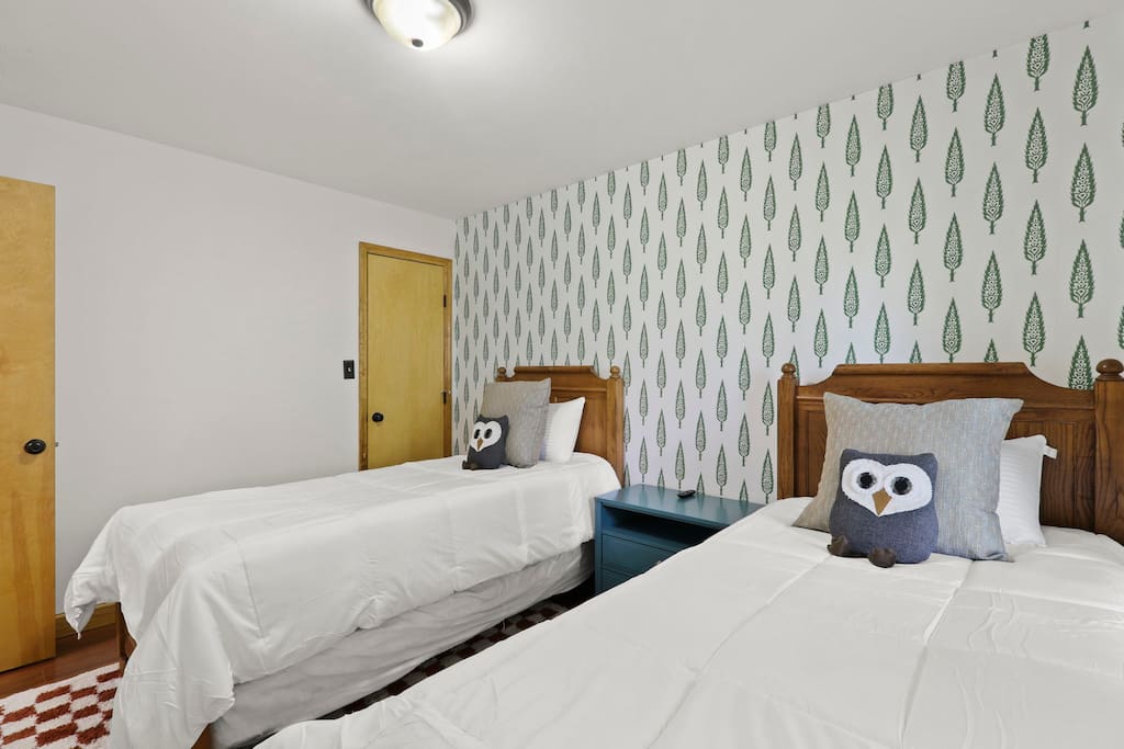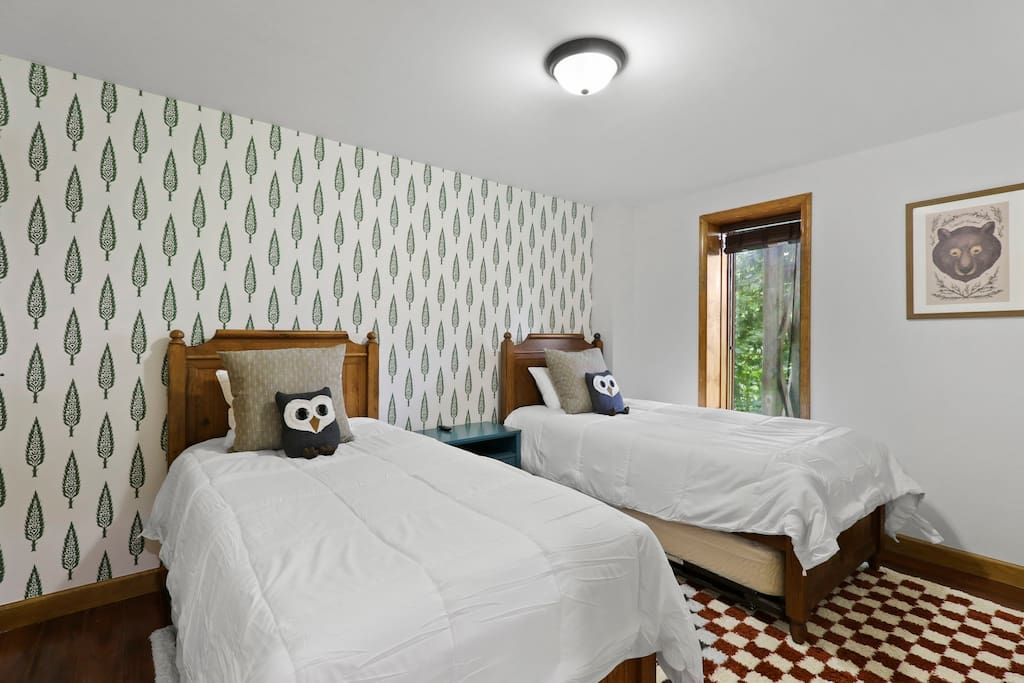 Kid-friendly forest-themed room with whimsical décor, owl pillows, and woodland wallpaper. Perfect for little adventurers with plush bedding and cozy charm. Includes TV, room-darkening shades, air conditioning, heating, clothing storage, hangers, bed linens, and extra pillows/blankets.