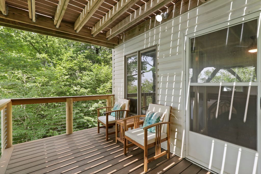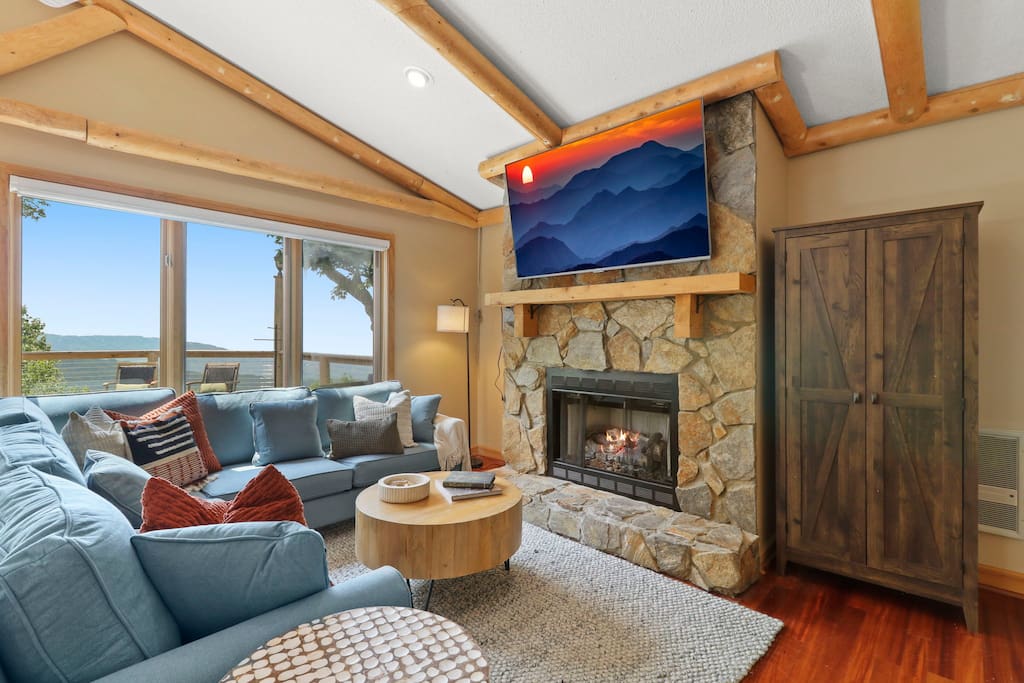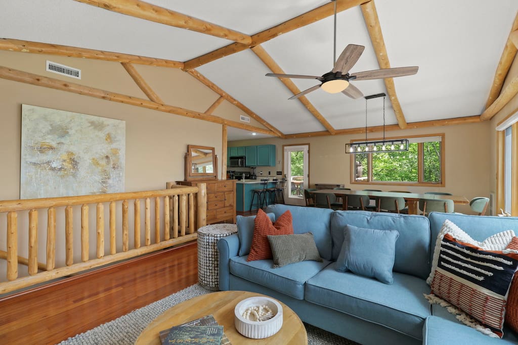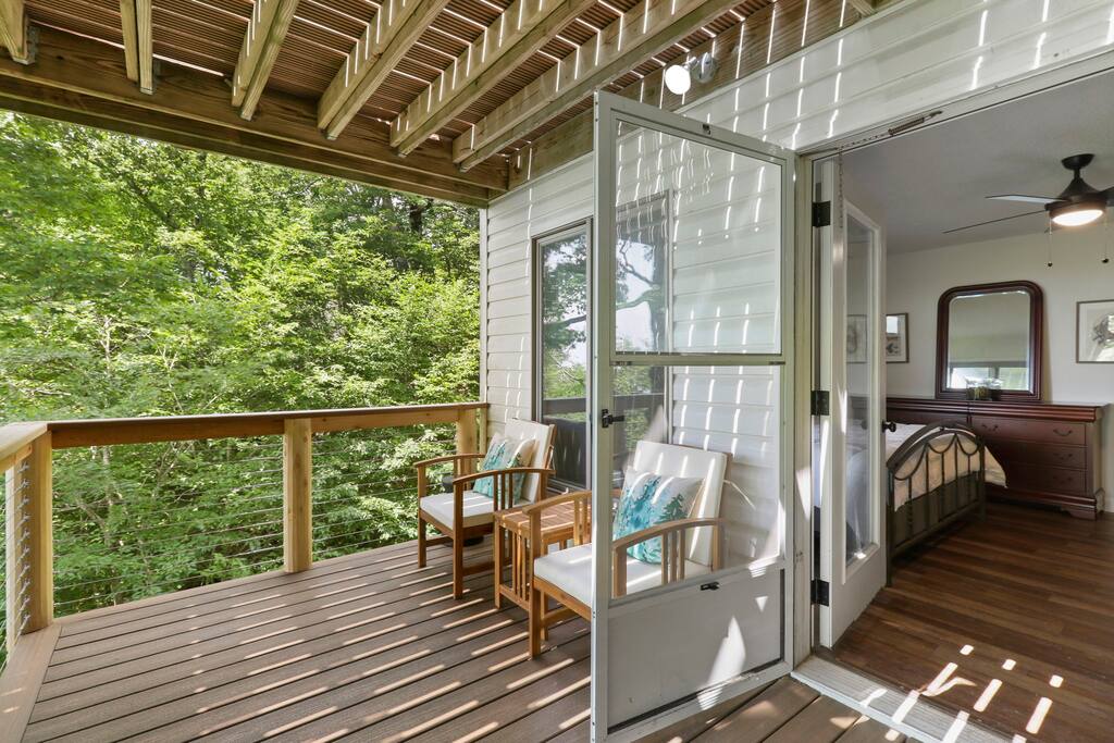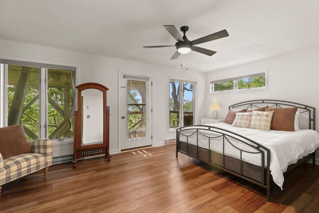 Spacious suite with classic charm, oversized dresser, and abundant natural light. Offers forest views, Smart TV, and private deck access—like your own treehouse retreat. Includes air conditioning, heating, ceiling fan, clothing storage, hangers, bed linens, and extra pillows/blankets.