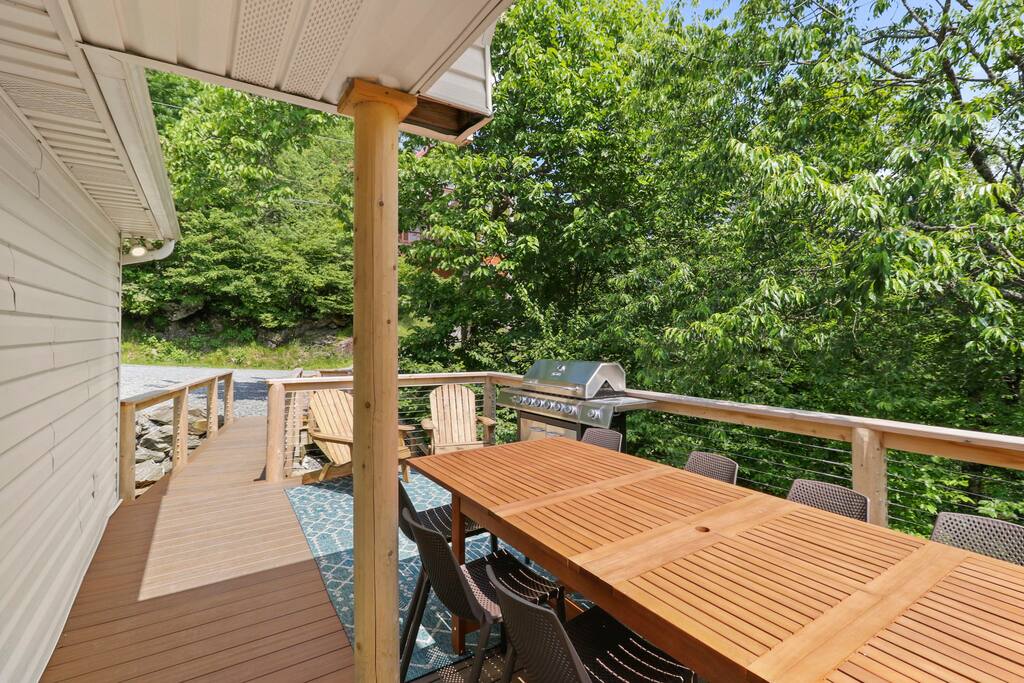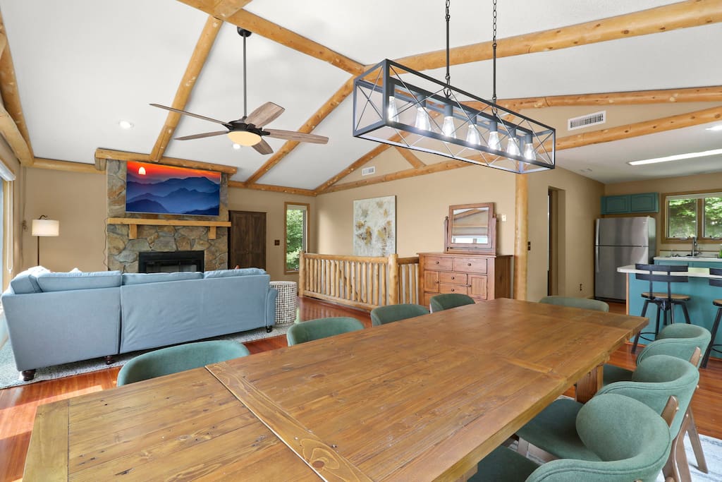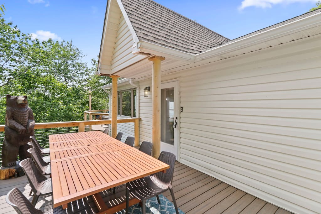 Spacious table with wooded views, perfect for meals, games, and planning adventures.