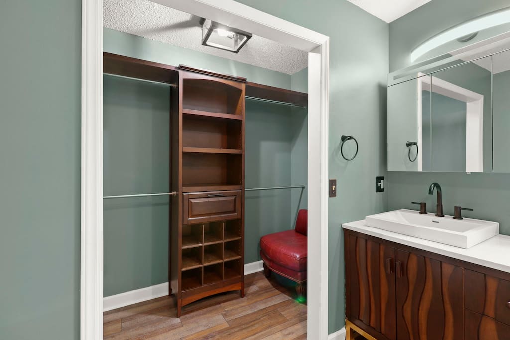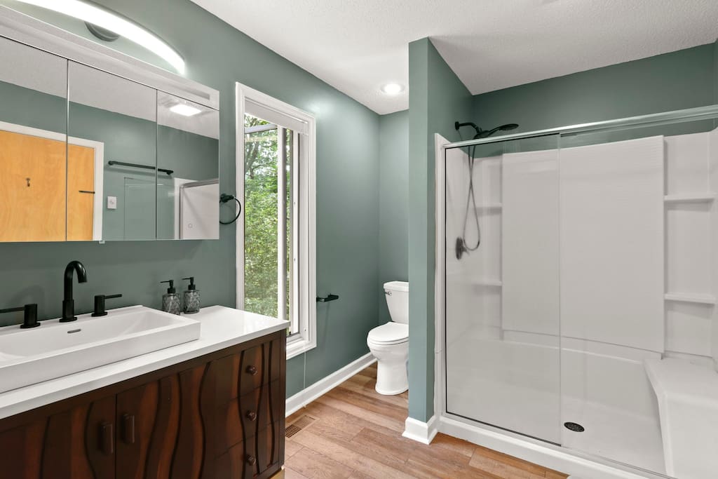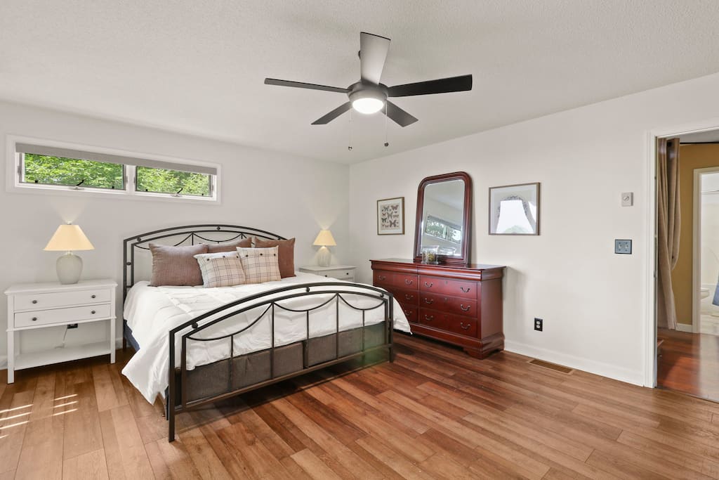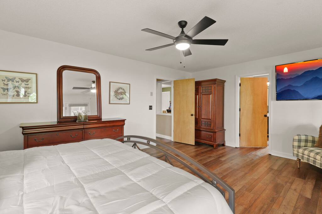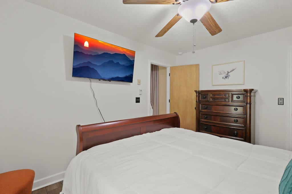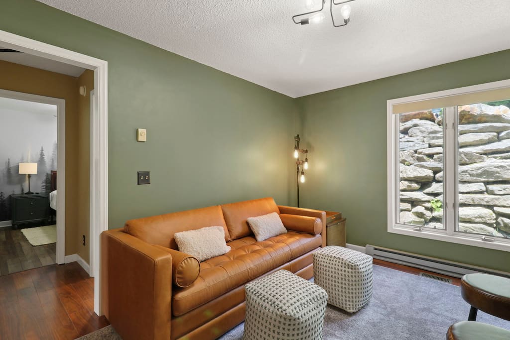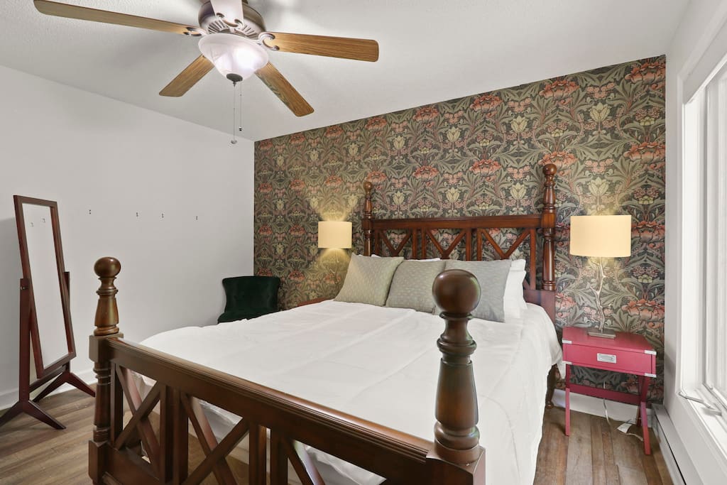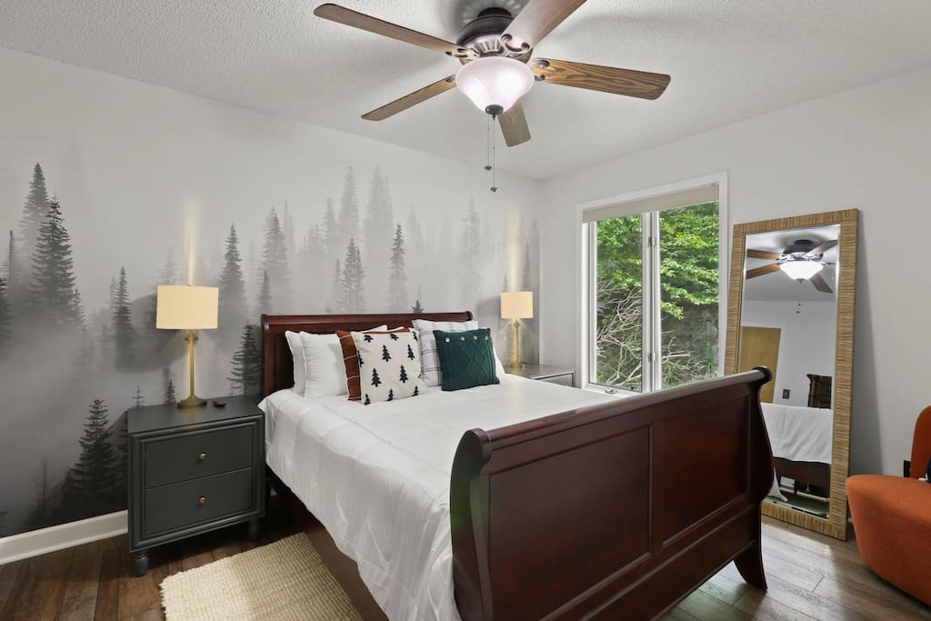 Peaceful retreat with forest views, cozy lighting, and vintage charm. Features a charming queen bed, rich wood furniture, and a bold botanical accent wall. Includes air conditioning, heating, ceiling fan, clothing storage, bed linens, and extra pillows/blankets.