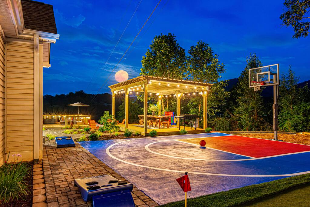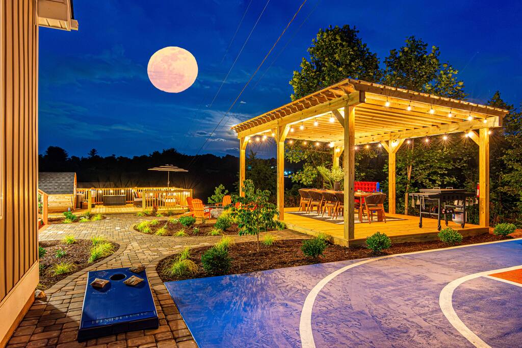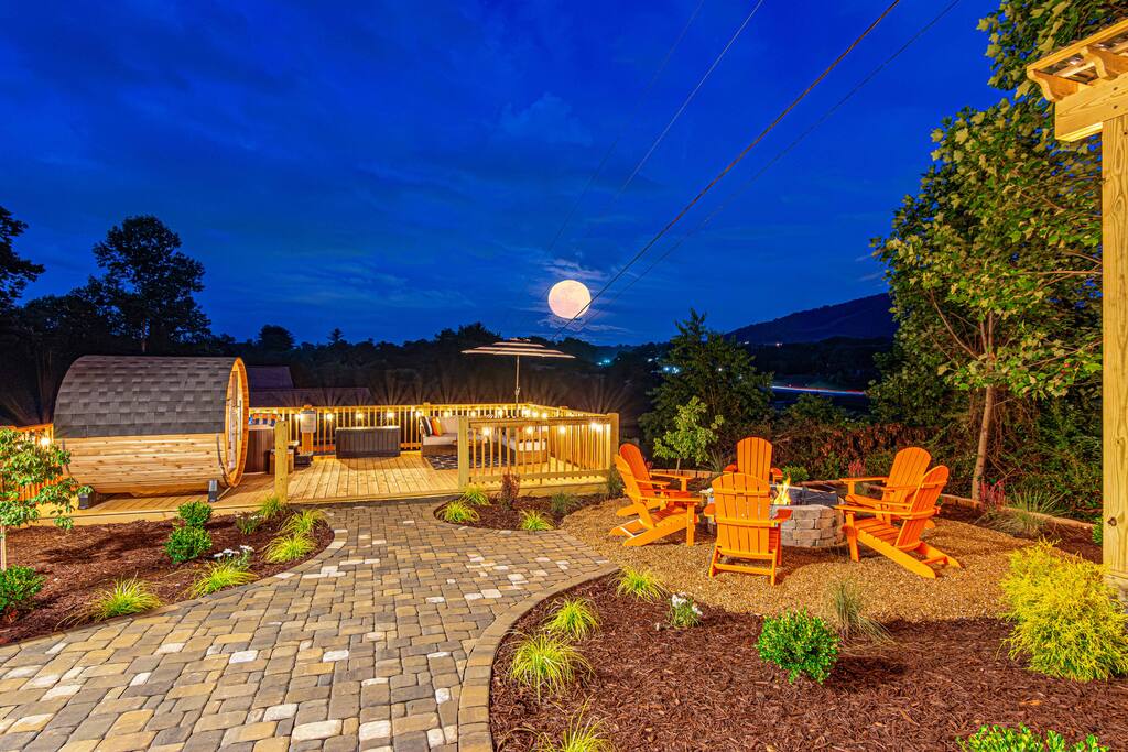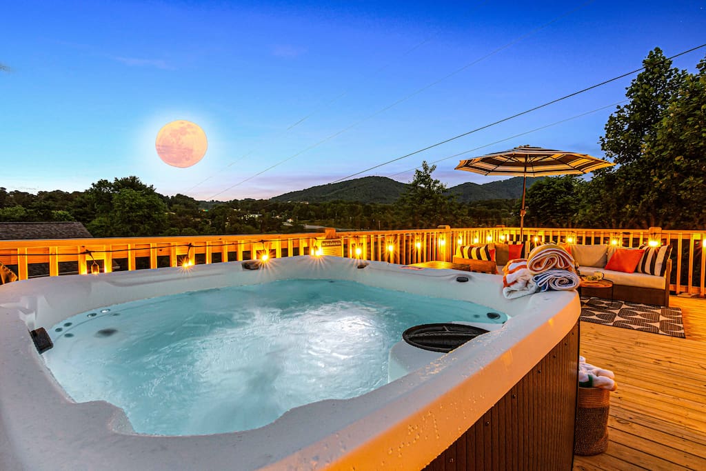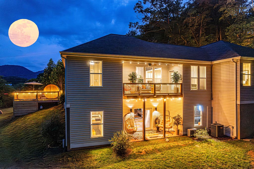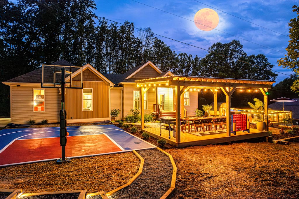Located in a quiet, scenic neighborhood just 15 minutes from downtown Asheville, Fly Me to the Moon Retreat offers the perfect blend of peaceful mountain living and easy access to the city’s vibrant culture. Guests can soak in panoramic sunset views from the spacious outdoor dining area, complete with a half-court basketball setup, mini golf course, and a one-of-a-kind geodome for relaxing or stargazing and spacious yard. You're just a short drive from Asheville’s top restaurants, the iconic Biltmore Estate (20 minutes), and the creative River Arts District (15 minutes), with local hiking trails only 30 minutes away. It’s a serene, activity-rich base for exploring everything Asheville has to offer.