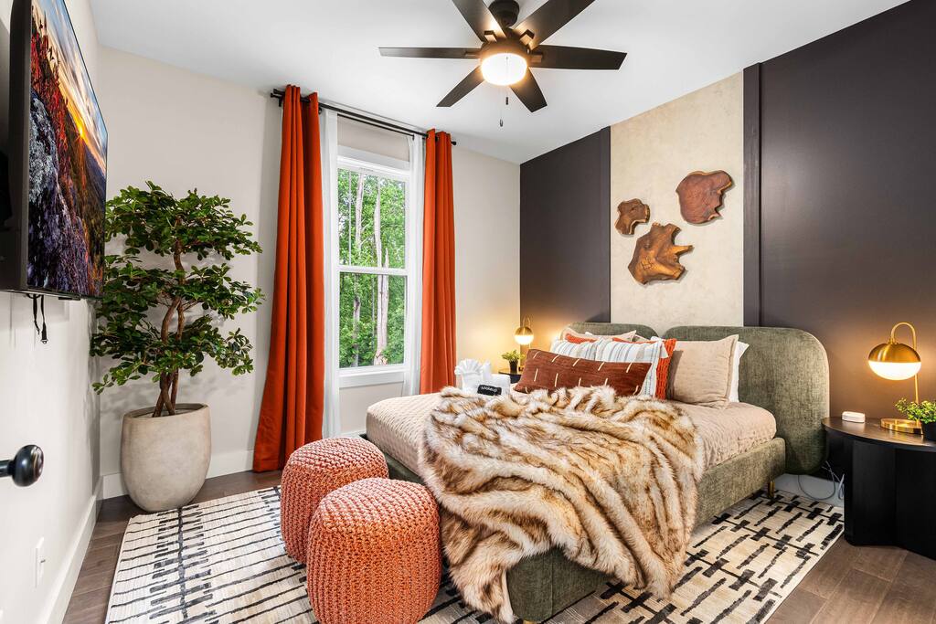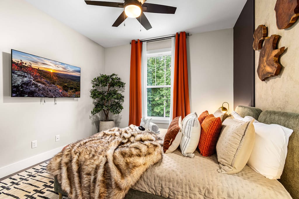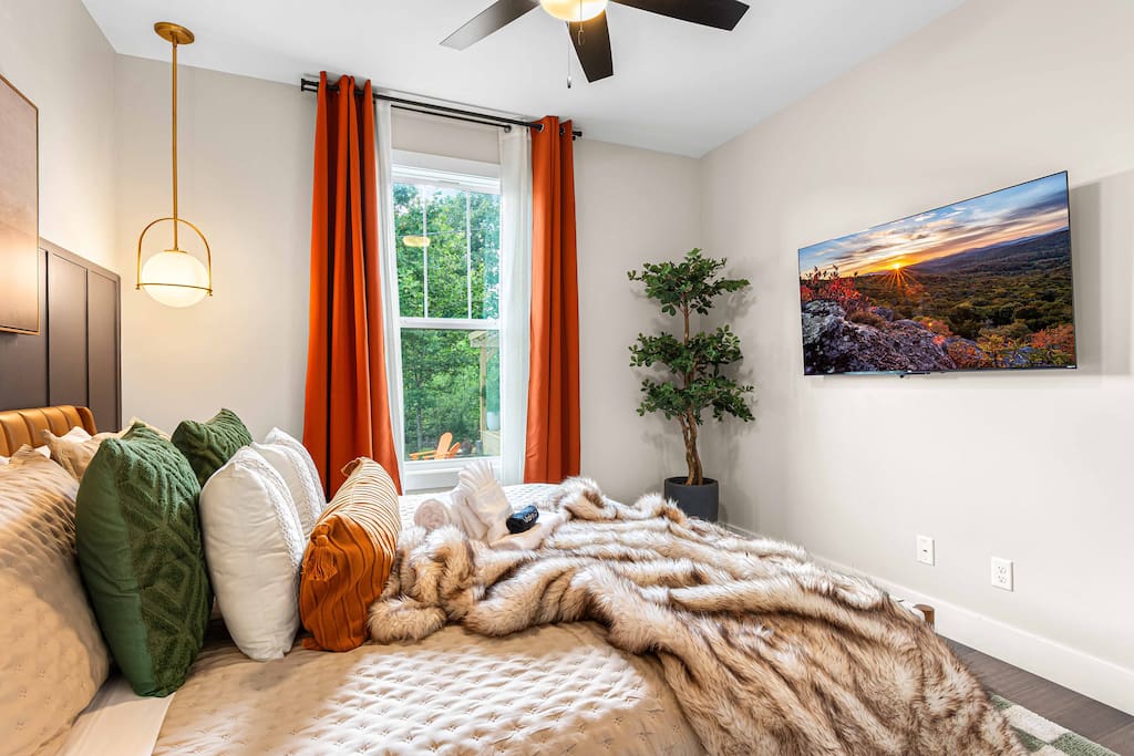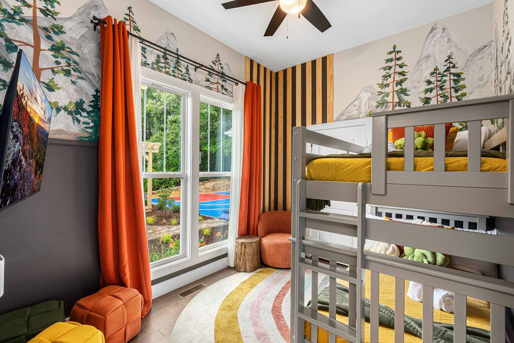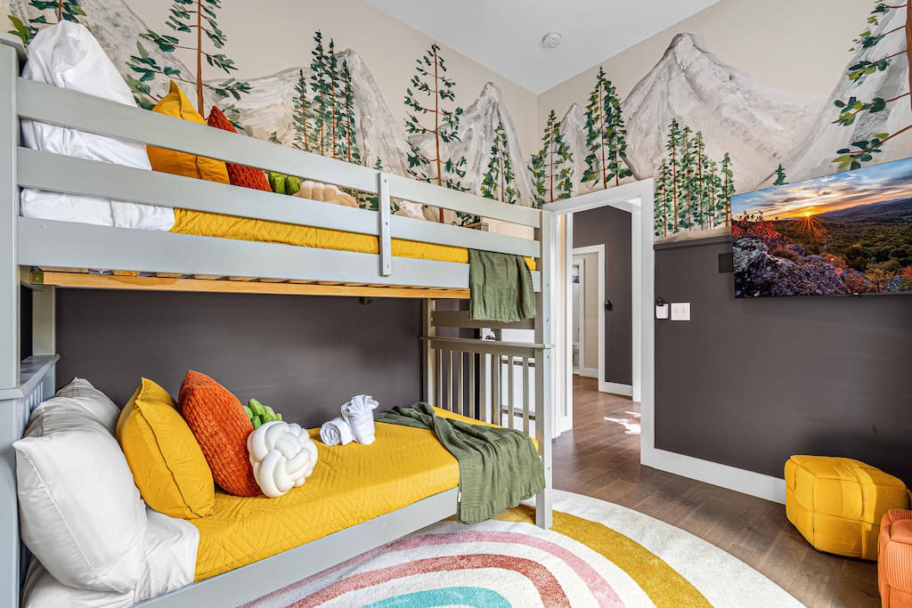 This cozy bunk room features a Smart TV, blackout curtains, and convenient charging stations—great for kids or extra guests.