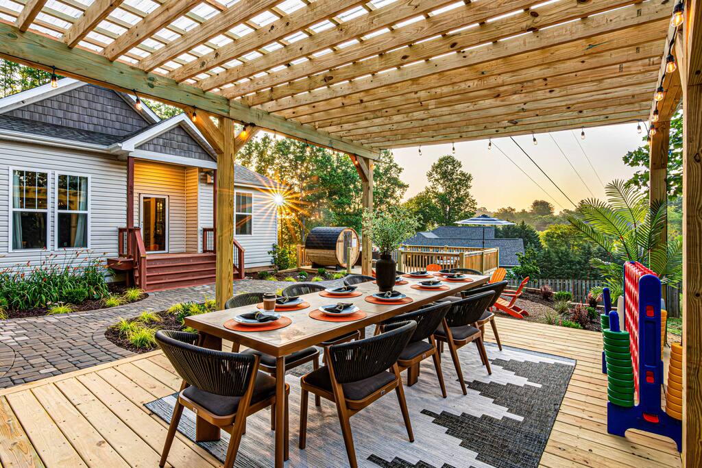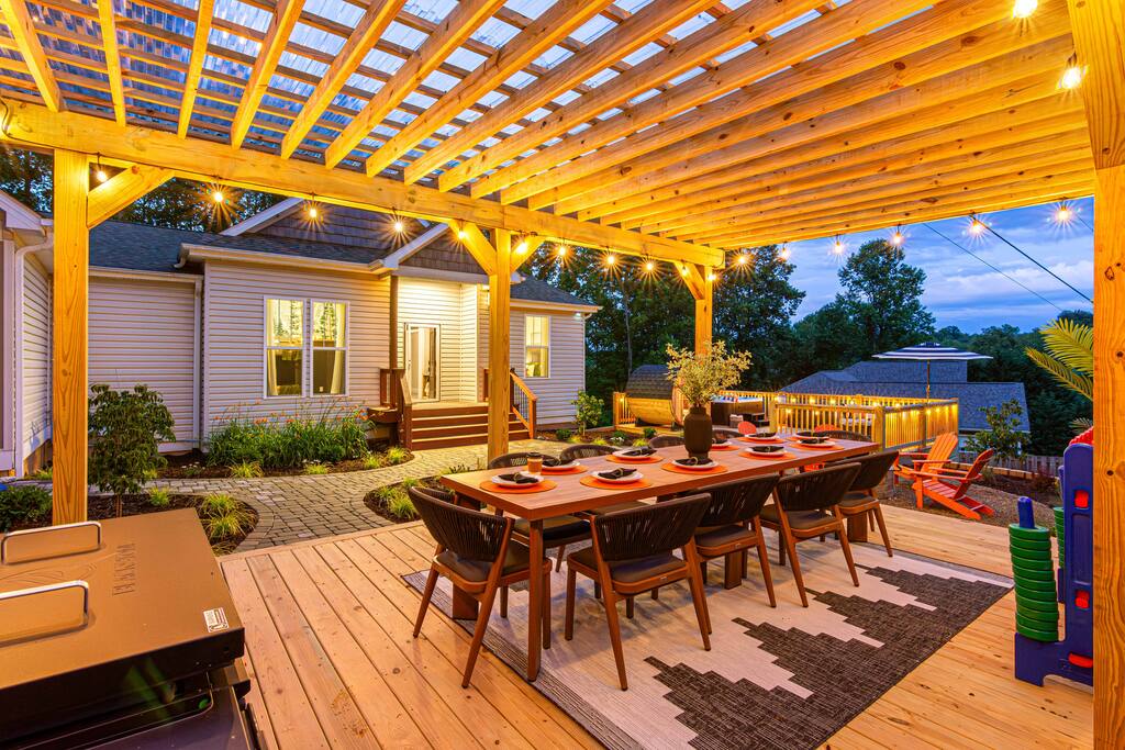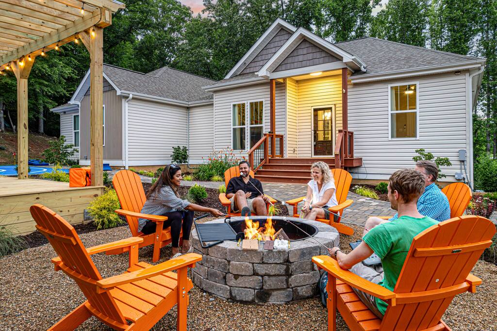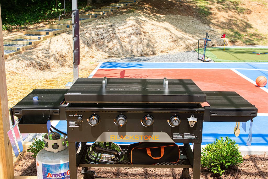 Host group meals outdoors with seating for 12 around the table and extra chairs around the firepit nearby, and a professional-style Blackstone grill for easy cooking.