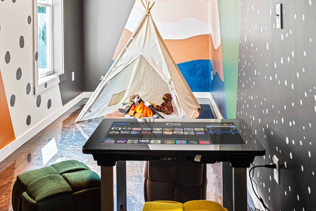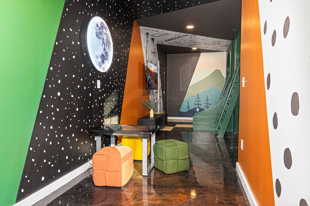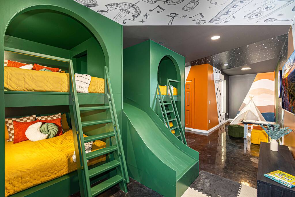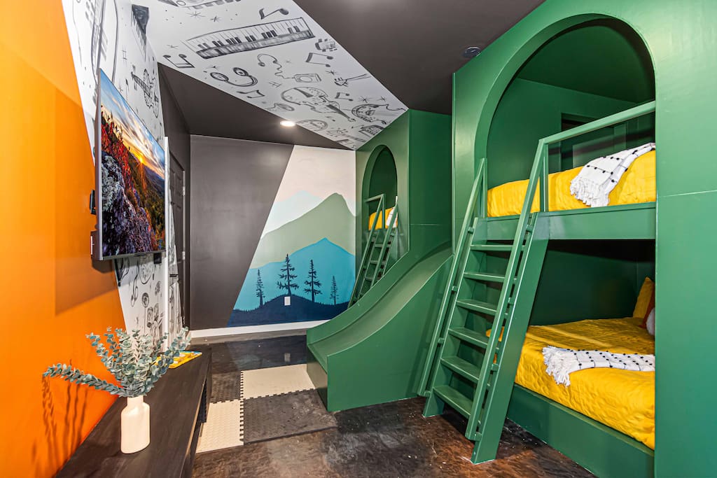 A dream space for kids or groups with built-in SLIDES between bunks, a Smart TV, infinity game table, play area, charging stations, and blackout curtains for extra rest and fun.
