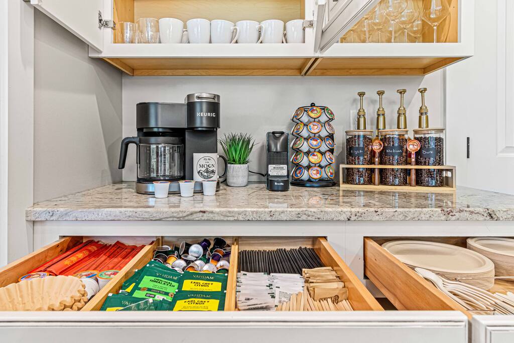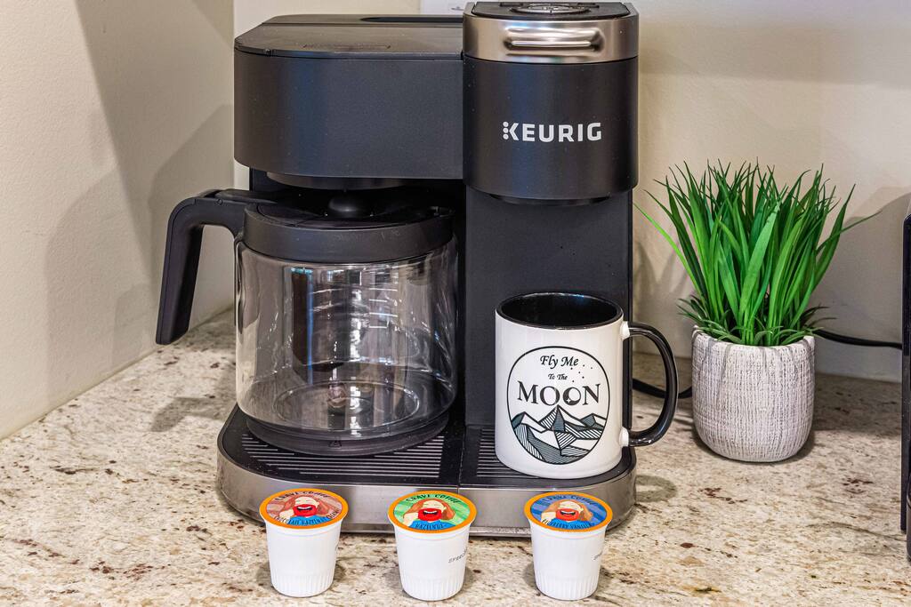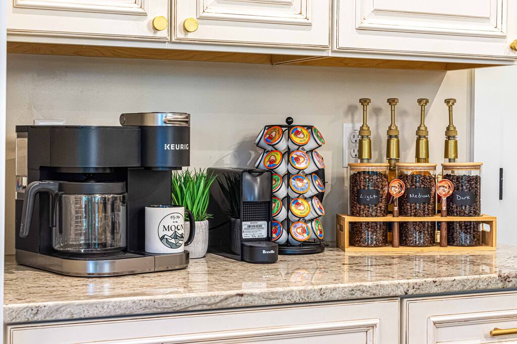 Enjoy both single-serve K-Cups and full pots of coffee with a versatile Keurig Duo machine. The coffee bar is also fully stocked with pods and syrups.