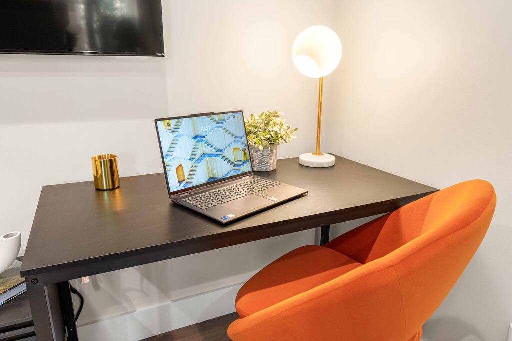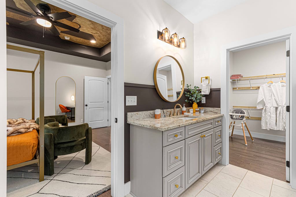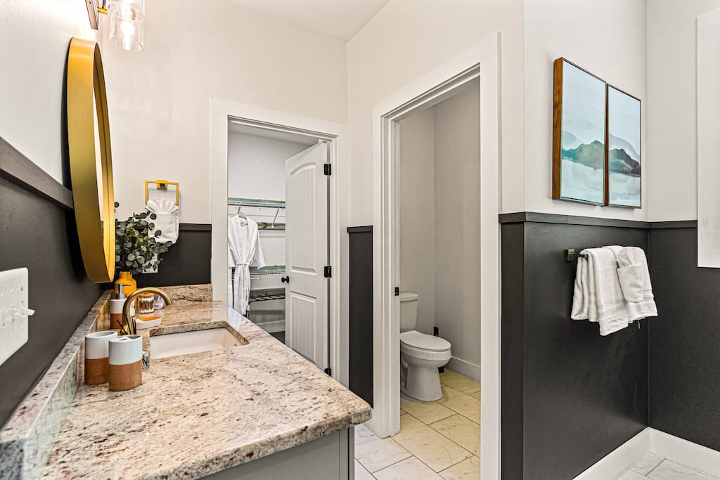 This spacious master suite features a king bed, private ensuite bathroom with double sinks, a Smart TV, blackout curtains, and phone charging stations. It also includes a convenient work desk and chair—perfect for remote work with high speed internet or for planning adventures.