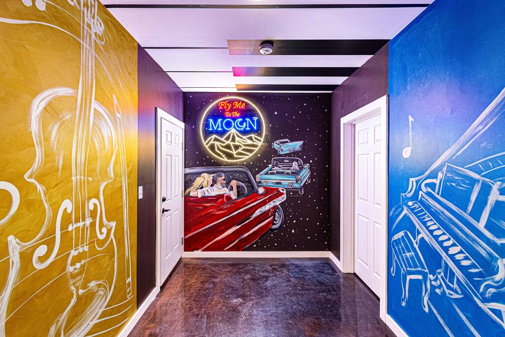This Fly Me to the Moon Retreat comfortably sleeps up to 20 guests across 6 thoughtfully designed bedrooms. Every bedroom includes plush bedding, blackout curtains, Smart TVs, and convenient charging stations for a comfortable and connected stay.