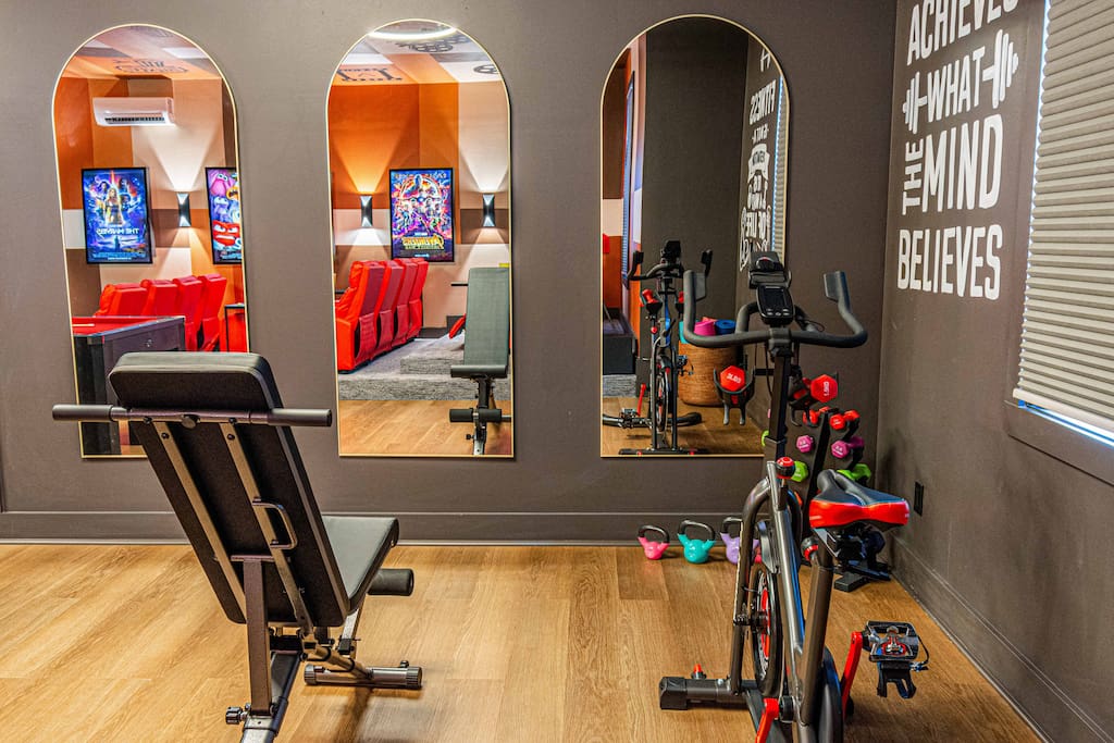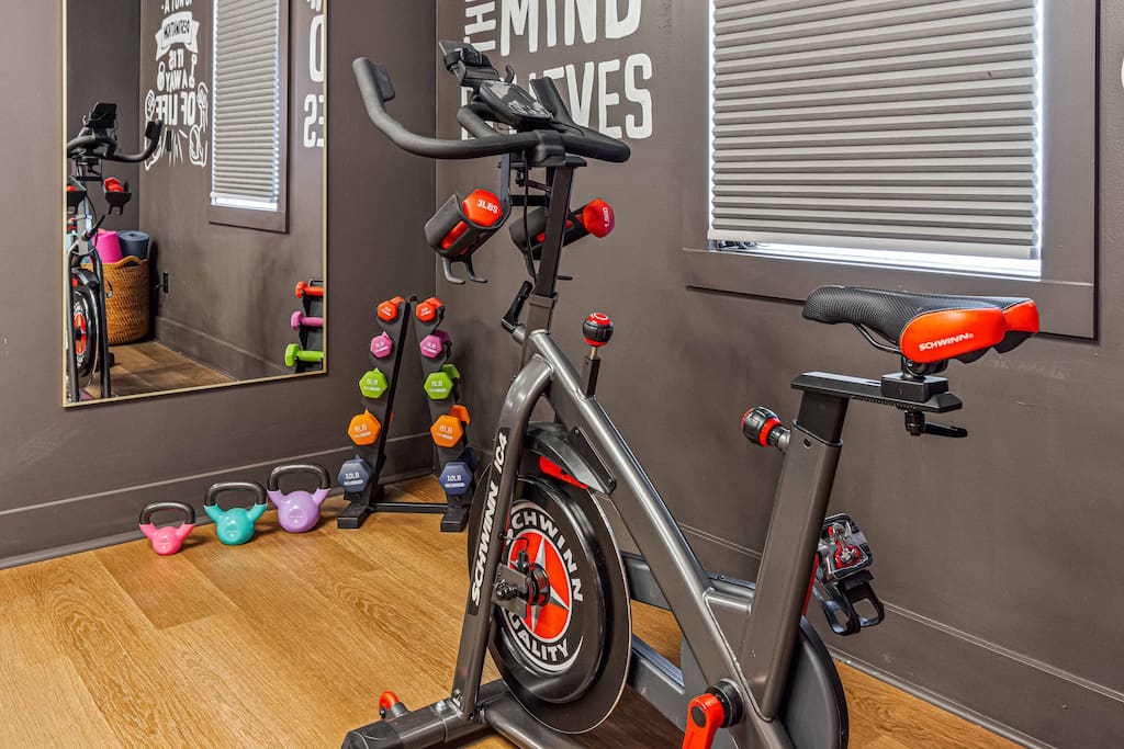 Stay active with a dedicated fitness space featuring a stationary bike, free weights, and room for yoga or stretching.