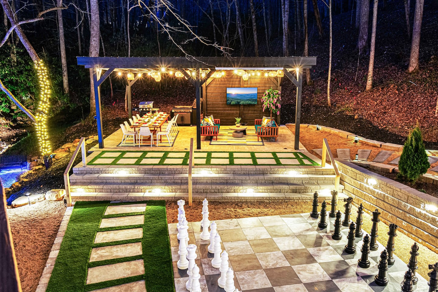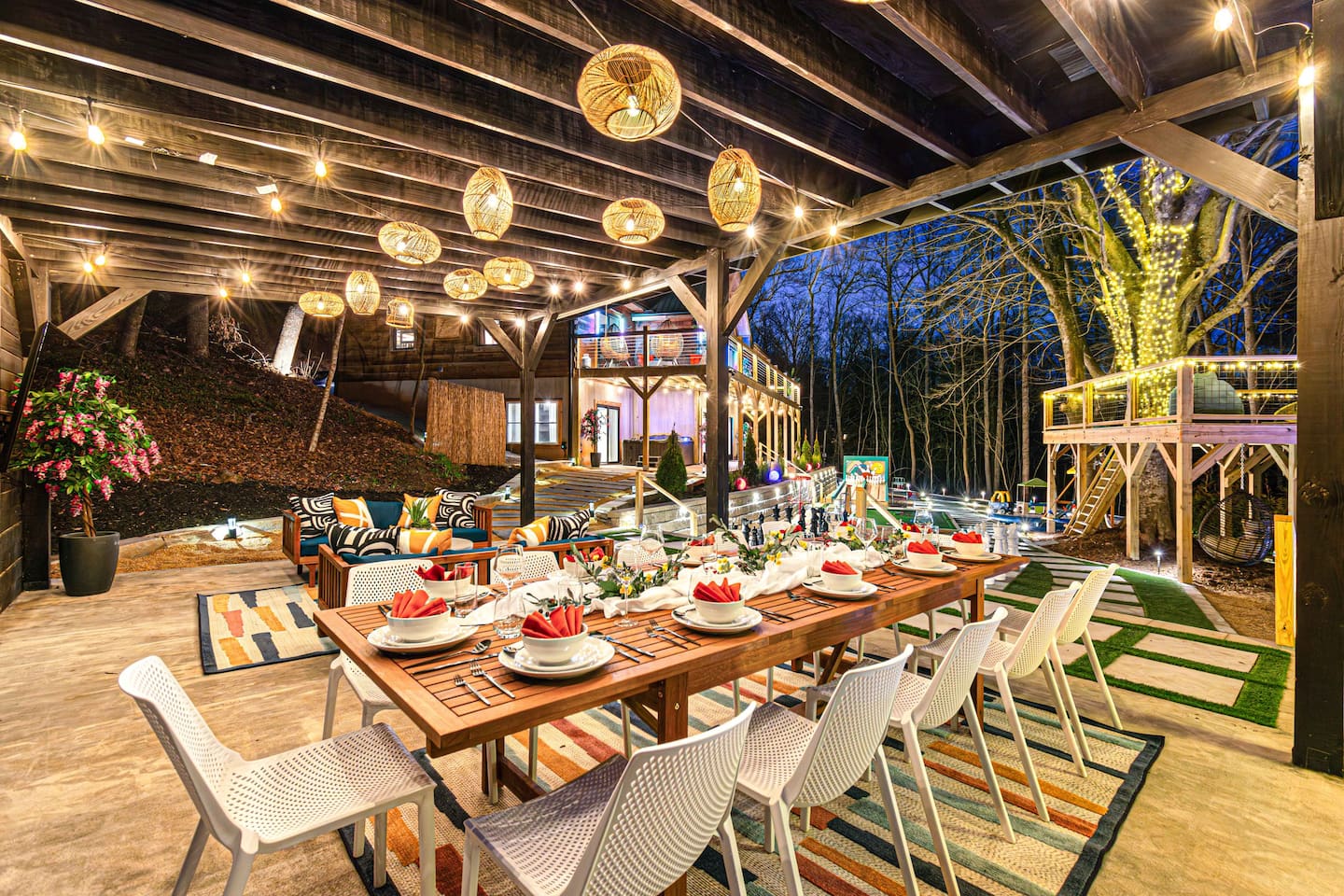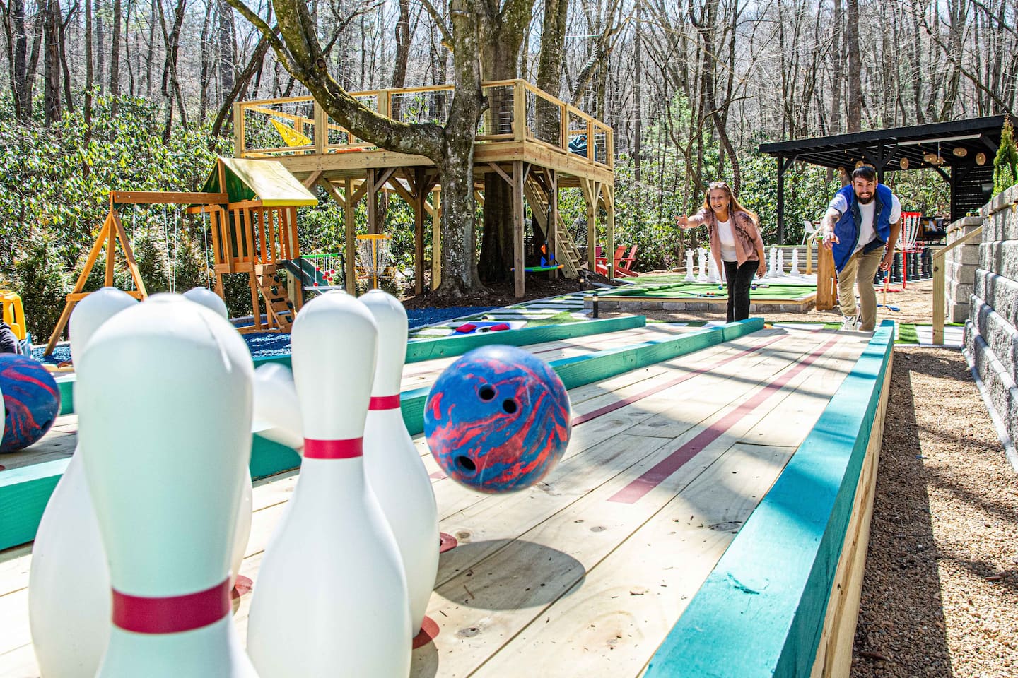 Outdoors, the resort transforms into a paradise featuring a mesmerizing tree deck, a bespoke bowling alley, a magnificent fire pit, mini-putt, disc-golf and a charming beach area by the creek for moments of serene relaxation. Revel in the beauty of nature as you dine under the stars in our outdoor pergola, equipped with a large dining area and a premium grilling station. For fun and games, challenge your loved ones at our mini putt, indulge in the excitement of the play area for kids, or unwind in one of our two luxurious hot tubs.