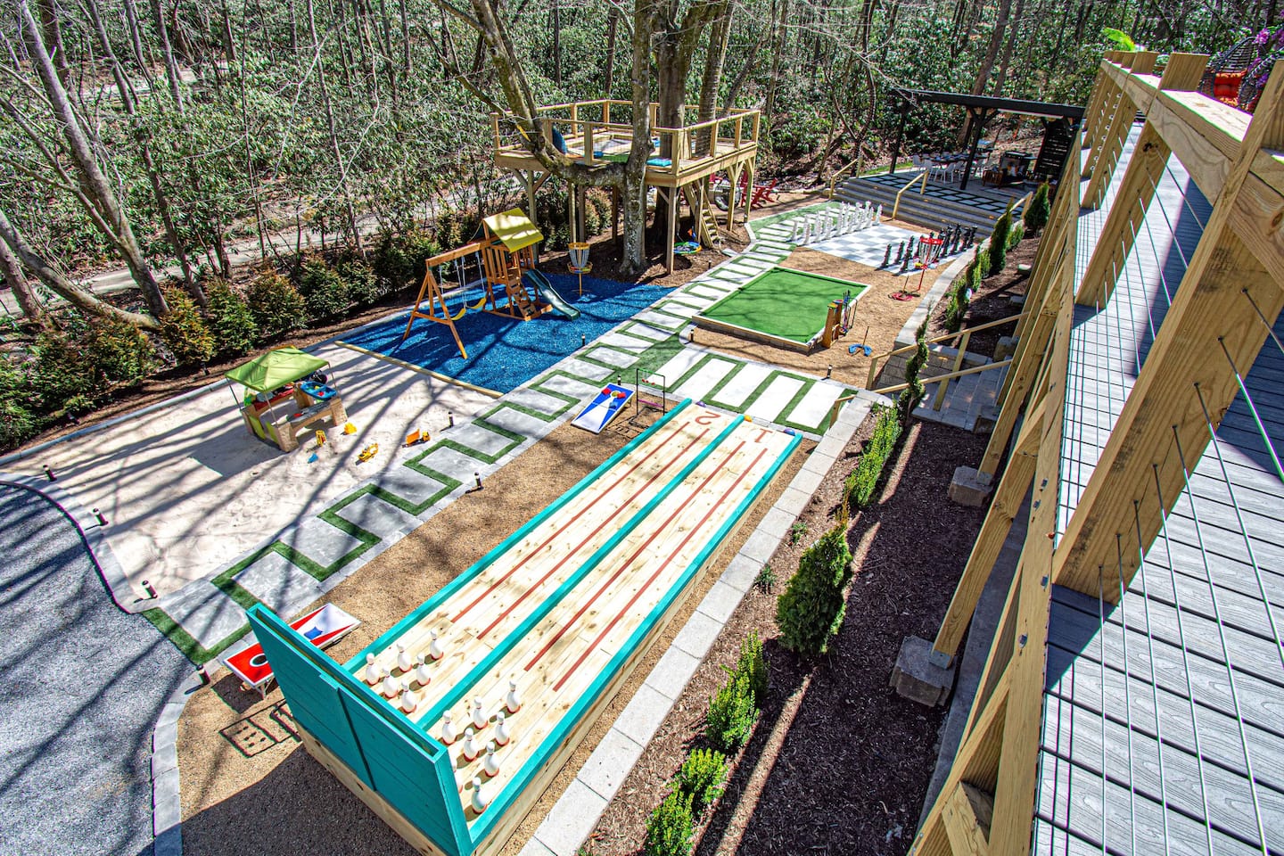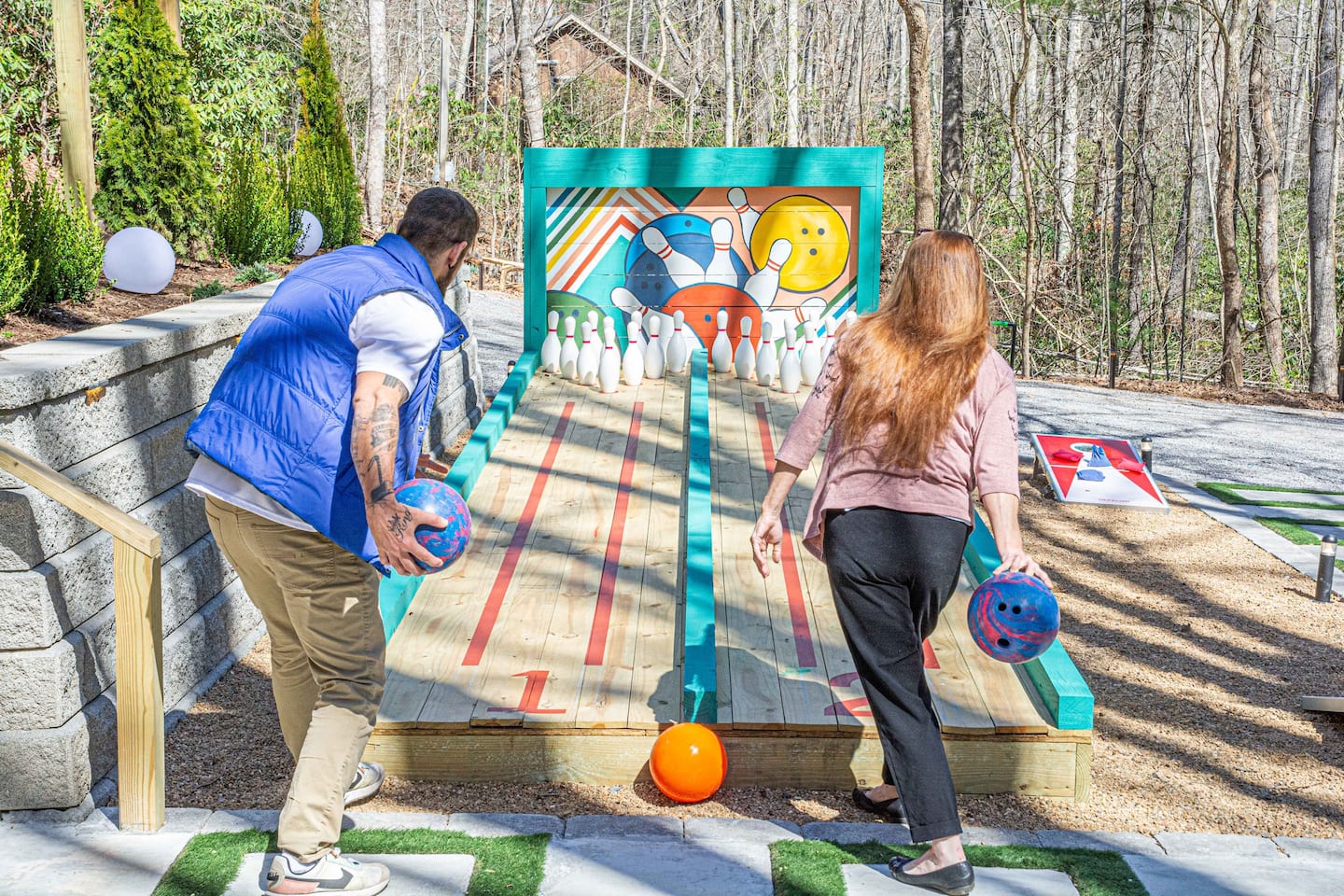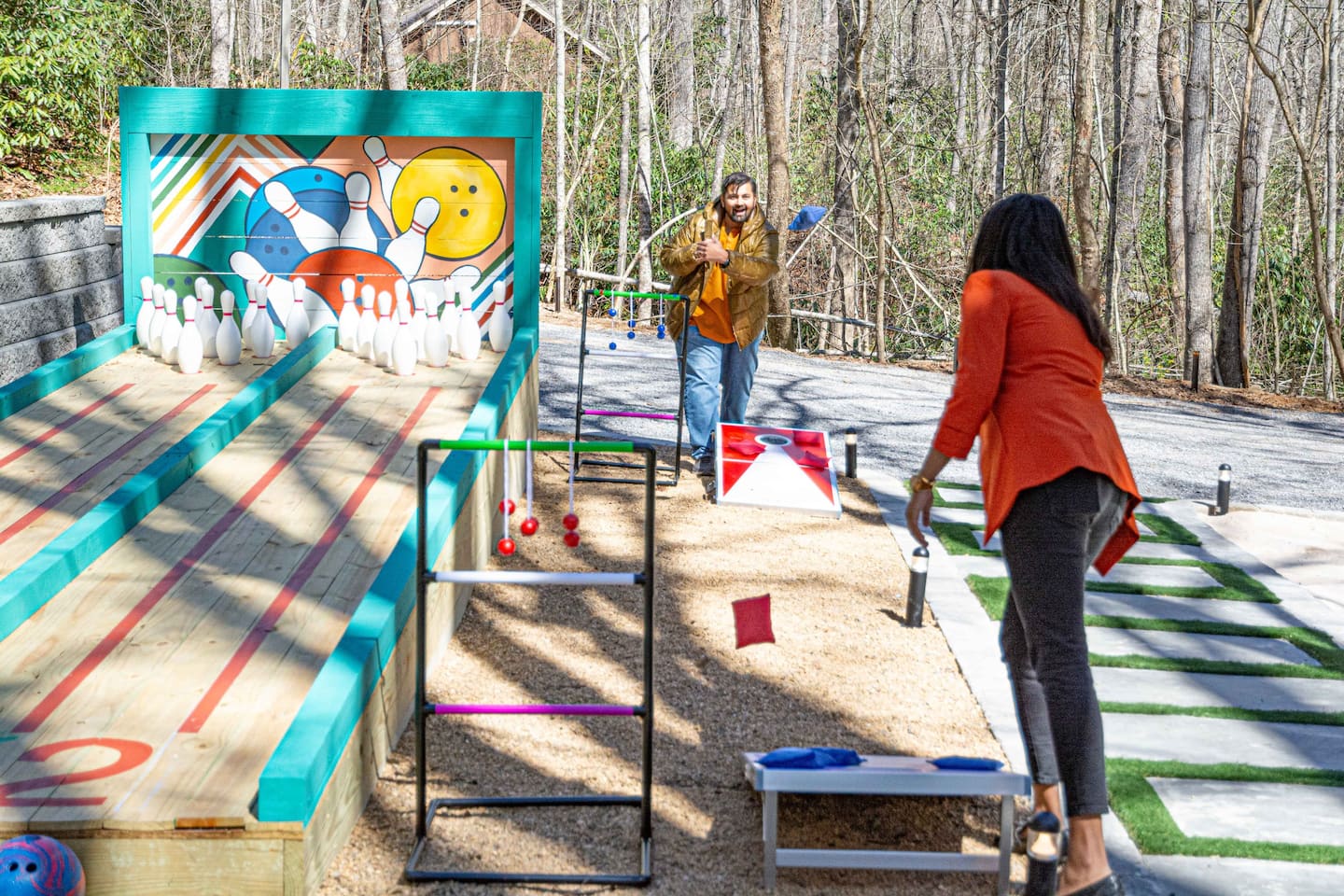 Outdoors, the resort transforms into a paradise featuring a mesmerizing tree deck, a bespoke bowling alley, a magnificent fire pit, mini-putt, disc-golf and a charming beach area by the creek for moments of serene relaxation. Revel in the beauty of nature as you dine under the stars in our outdoor pergola, equipped with a large dining area and a premium grilling station. For fun and games, challenge your loved ones at our mini putt, indulge in the excitement of the play area for kids, or unwind in one of our two luxurious hot tubs.
