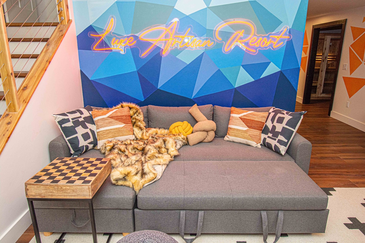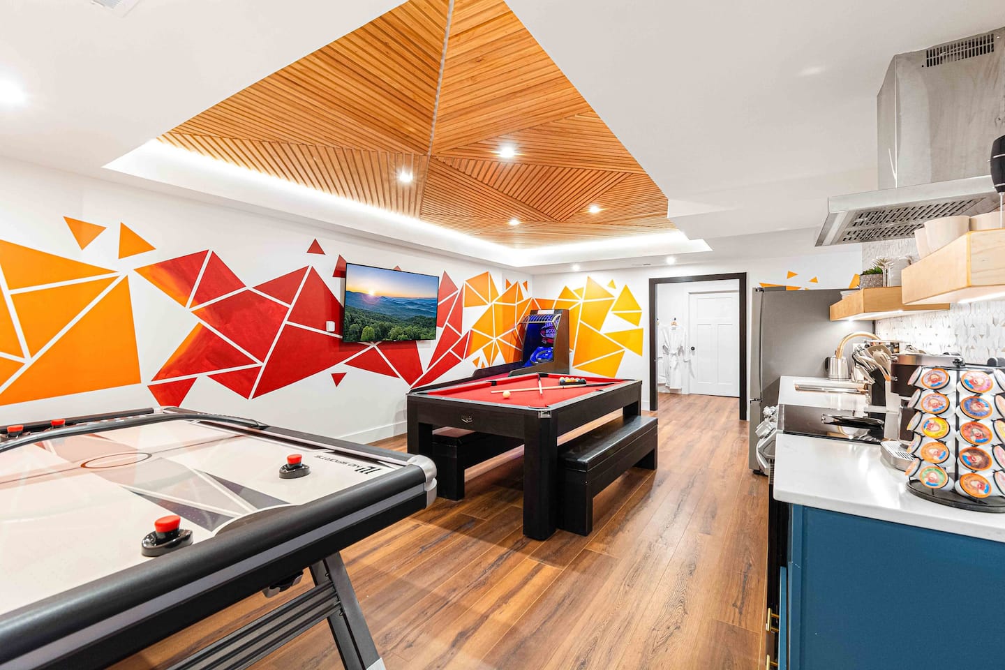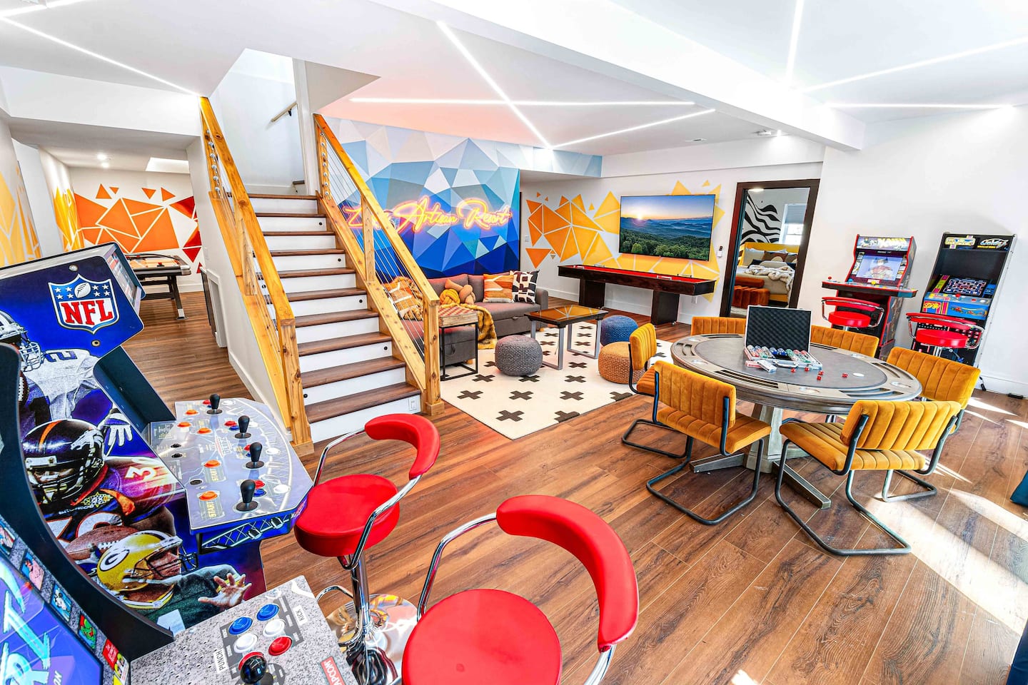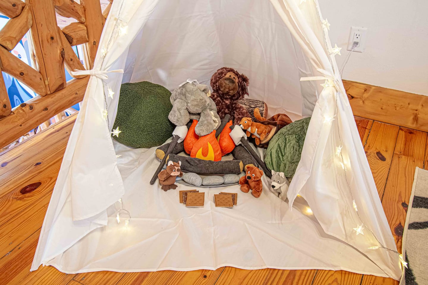 Regardless of the weather, Luxe Artisan Resort offers a range of indoor entertainment options. The lower level caters to all ages with games like skeeball, air hockey, ping pong, pool, and arcade games. For kids, there's a cozy tent area for play or reading. Enjoy movie marathons on the 75” Smart TV in the dedicated movie theater room.