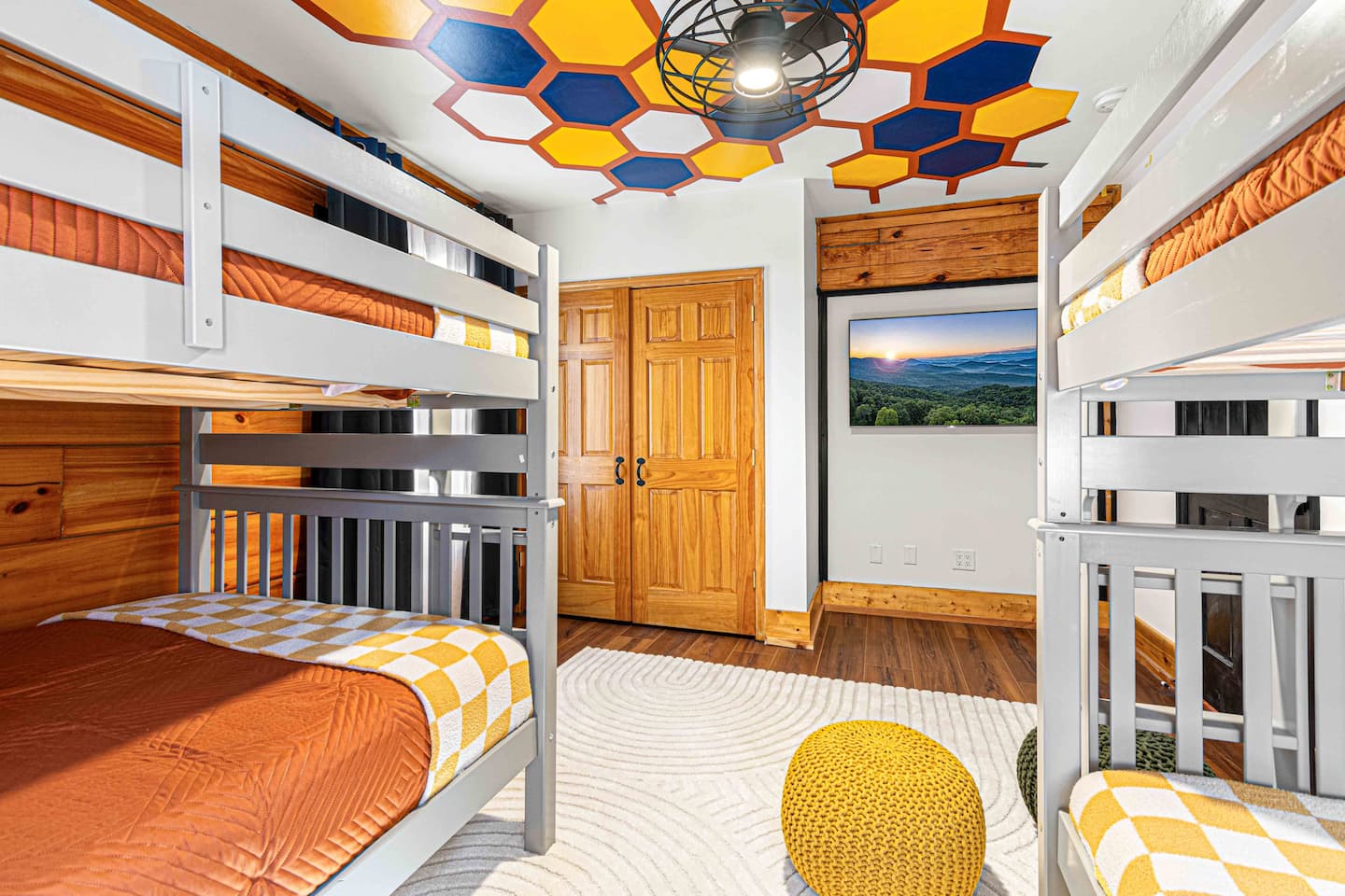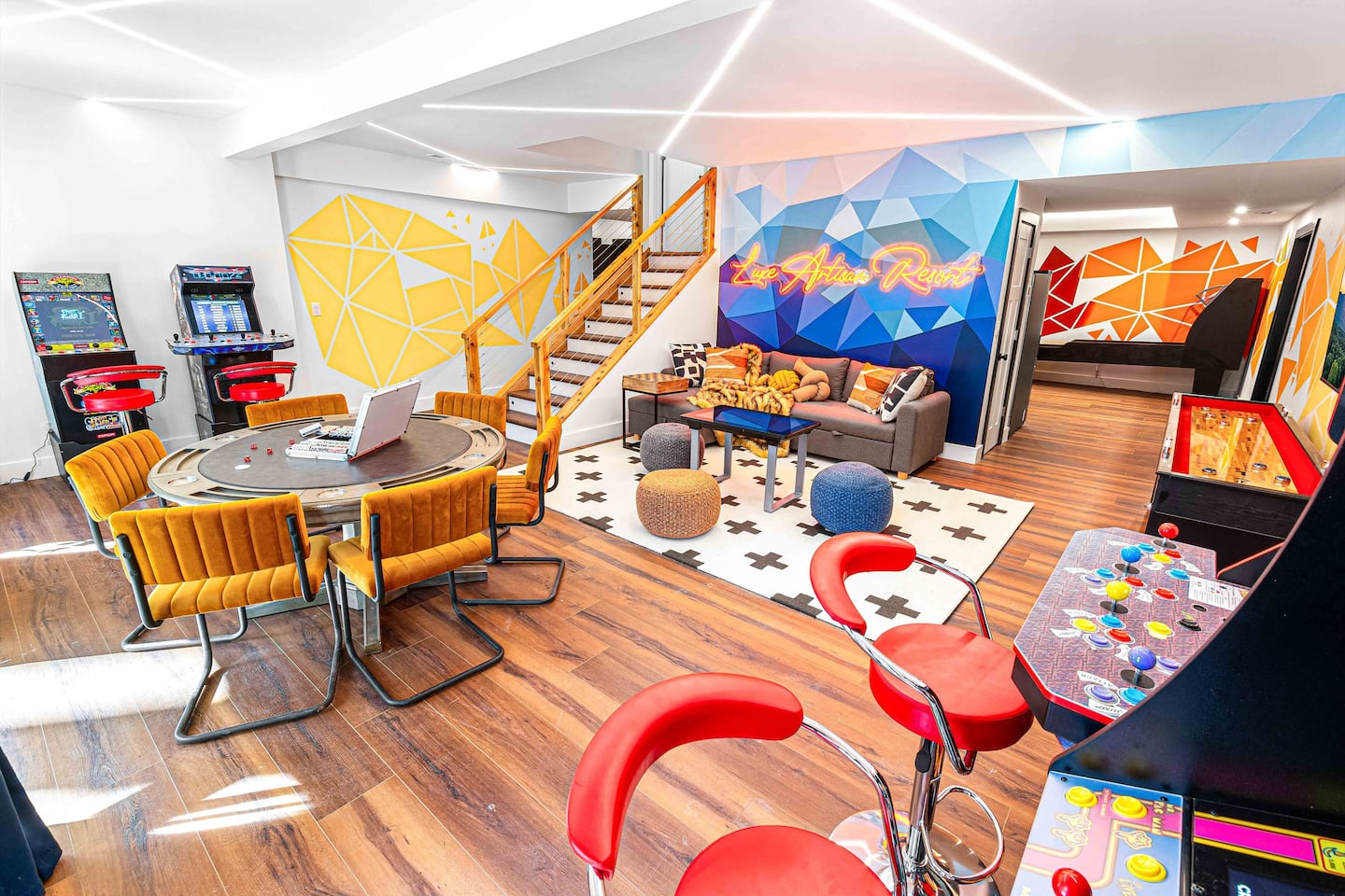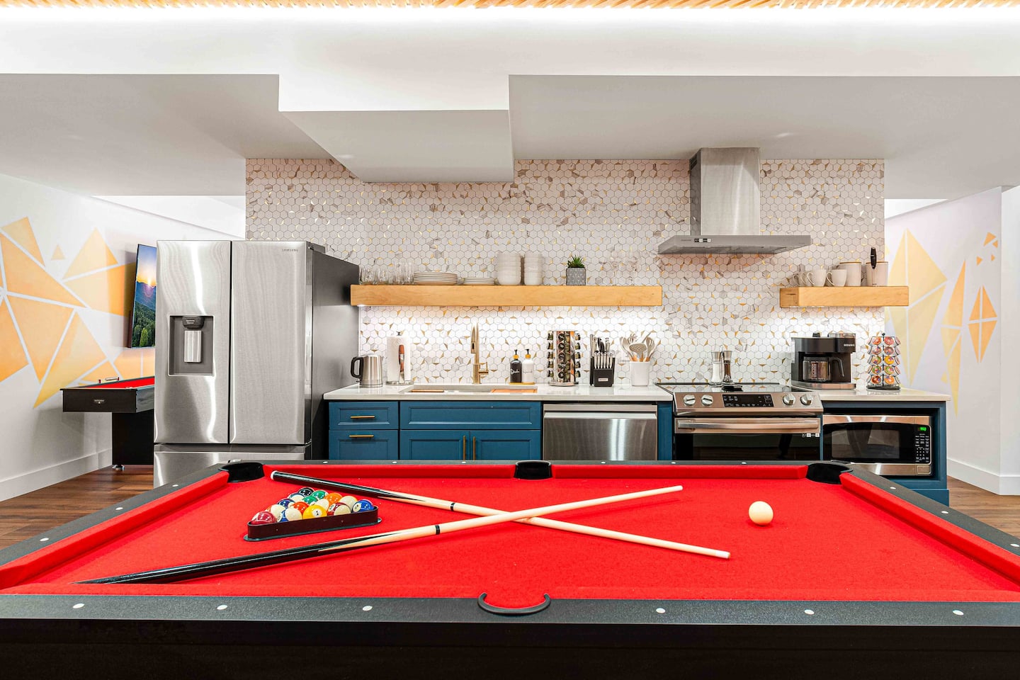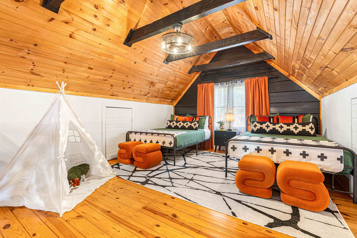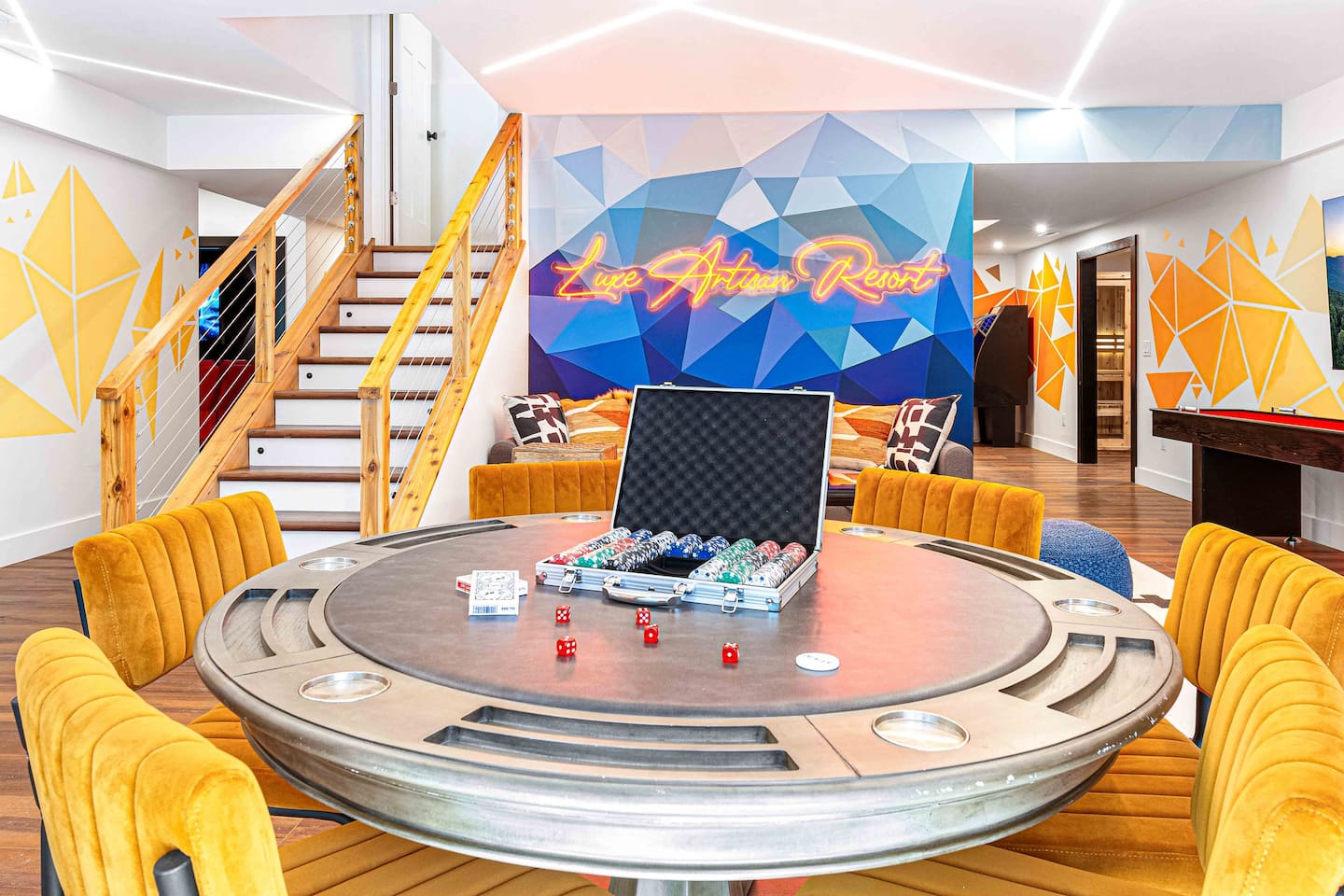 Regardless of the weather, Luxe Artisan Resort offers a range of indoor entertainment options. The lower level caters to all ages with games like skeeball, air hockey, ping pong, pool, and arcade games. For kids, there's a cozy tent area for play or reading. Enjoy movie marathons on the 75” Smart TV in the dedicated movie theater room.
