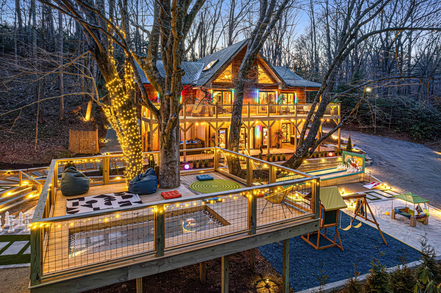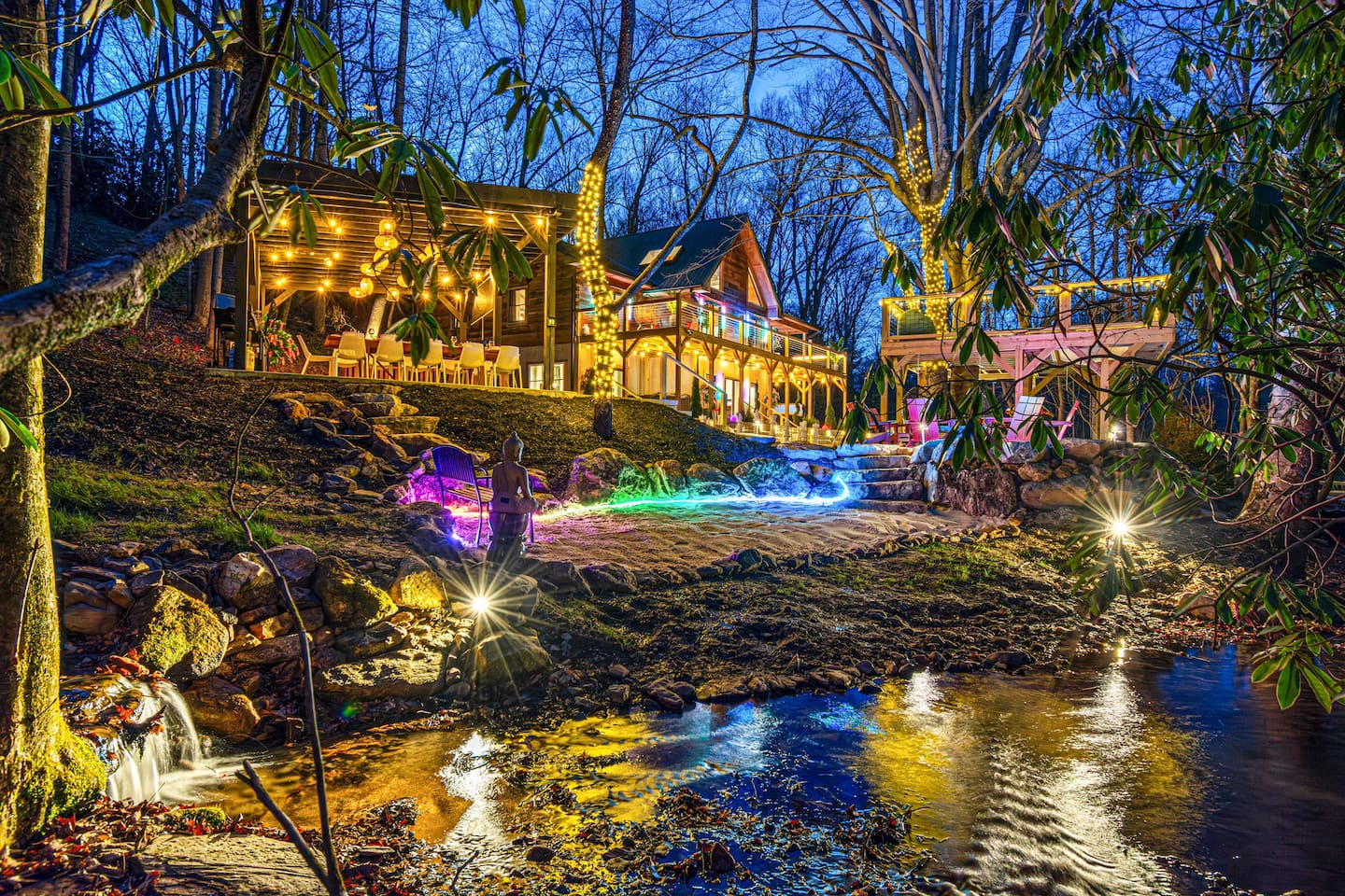 Luxe Artisan Resort is a luxury log cabin resort situated besides soothing sounds of a perennial creek in the tranquil Blue Ridge province. This family-friendly cabin sleeps 22 and offers an array of indoor/outdoor amenities. While the cabin is a destination within itself, its location is both supremely convenient and wonderfully secluded, merely a 5-minute trip to groceries and the charm of Black Mountain, and just 20 minutes away from the attractions of Asheville.