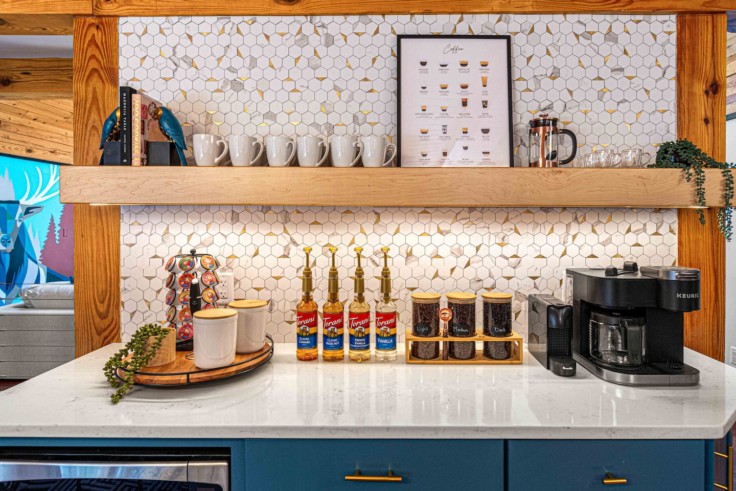 Our fully stocked chef's kitchen, complete with high-end appliances and a comprehensive coffee bar, caters to every culinary need and preference—a true paradise for any food lover.