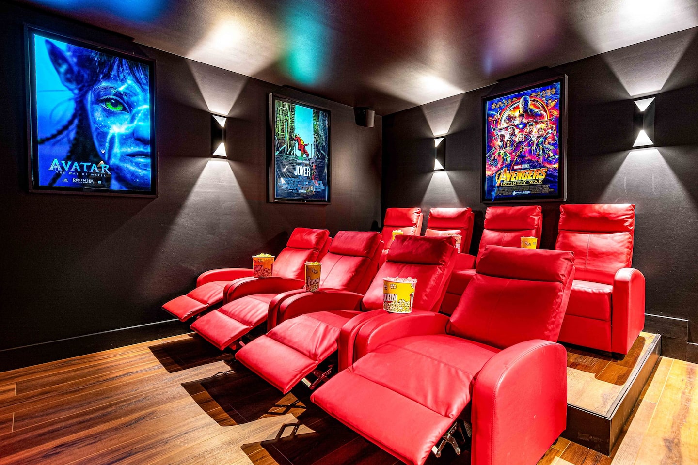 ...Dedicated movie room with 8 recliners and pop-corn machine