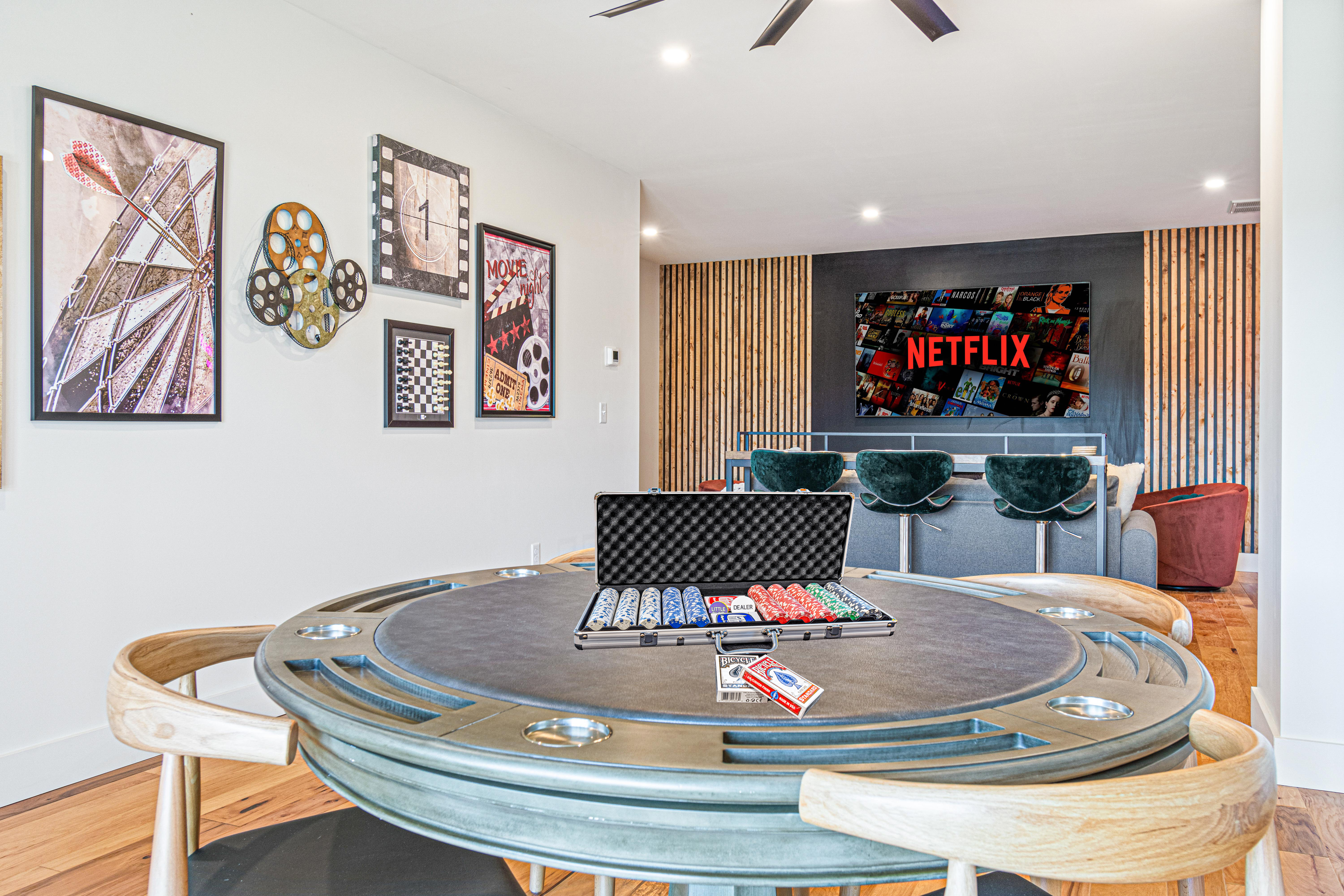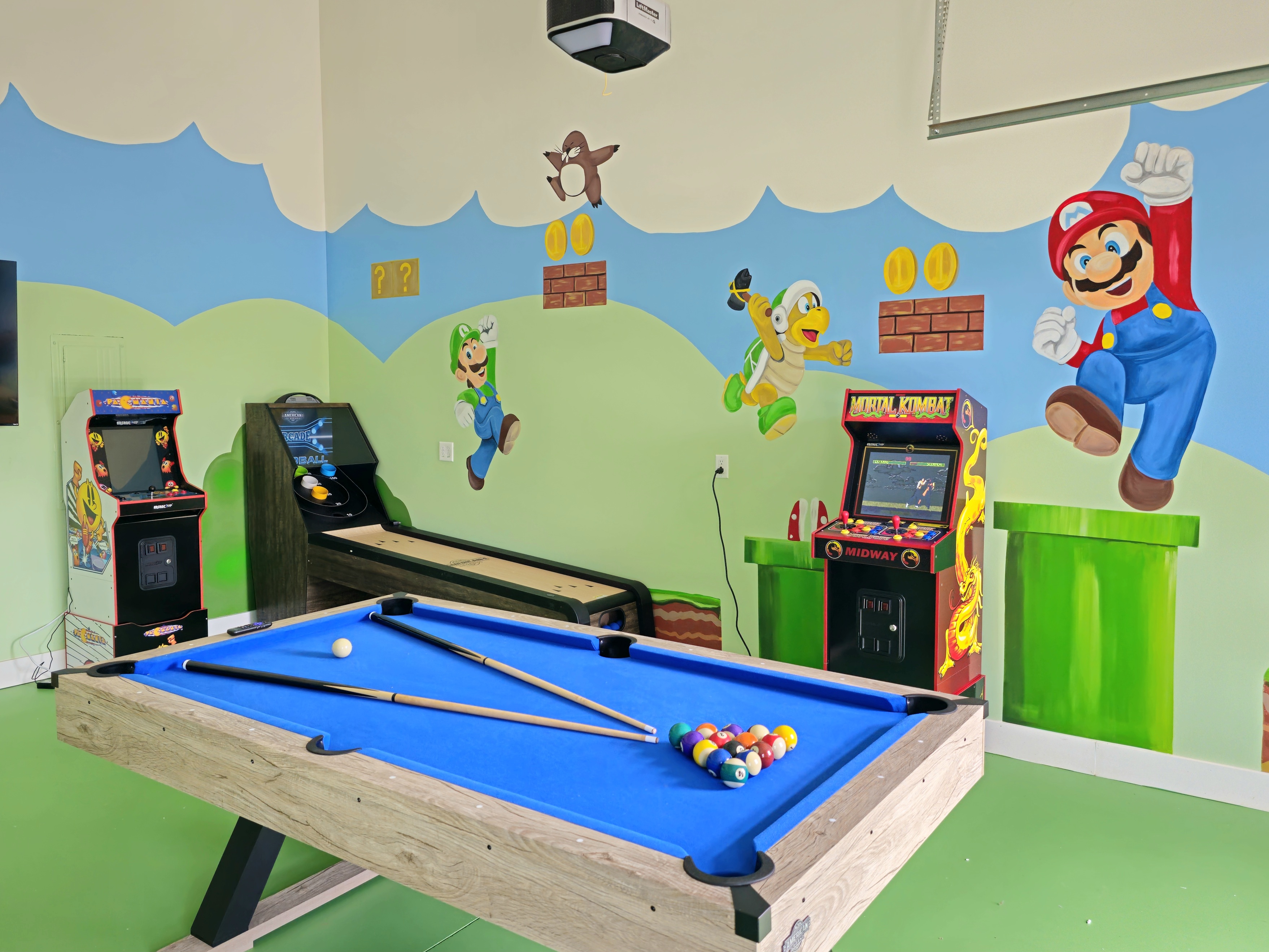 A haven of entertainment featuring a Pool Table, Air Hockey, Shuffleboard, and Arcade Machines.