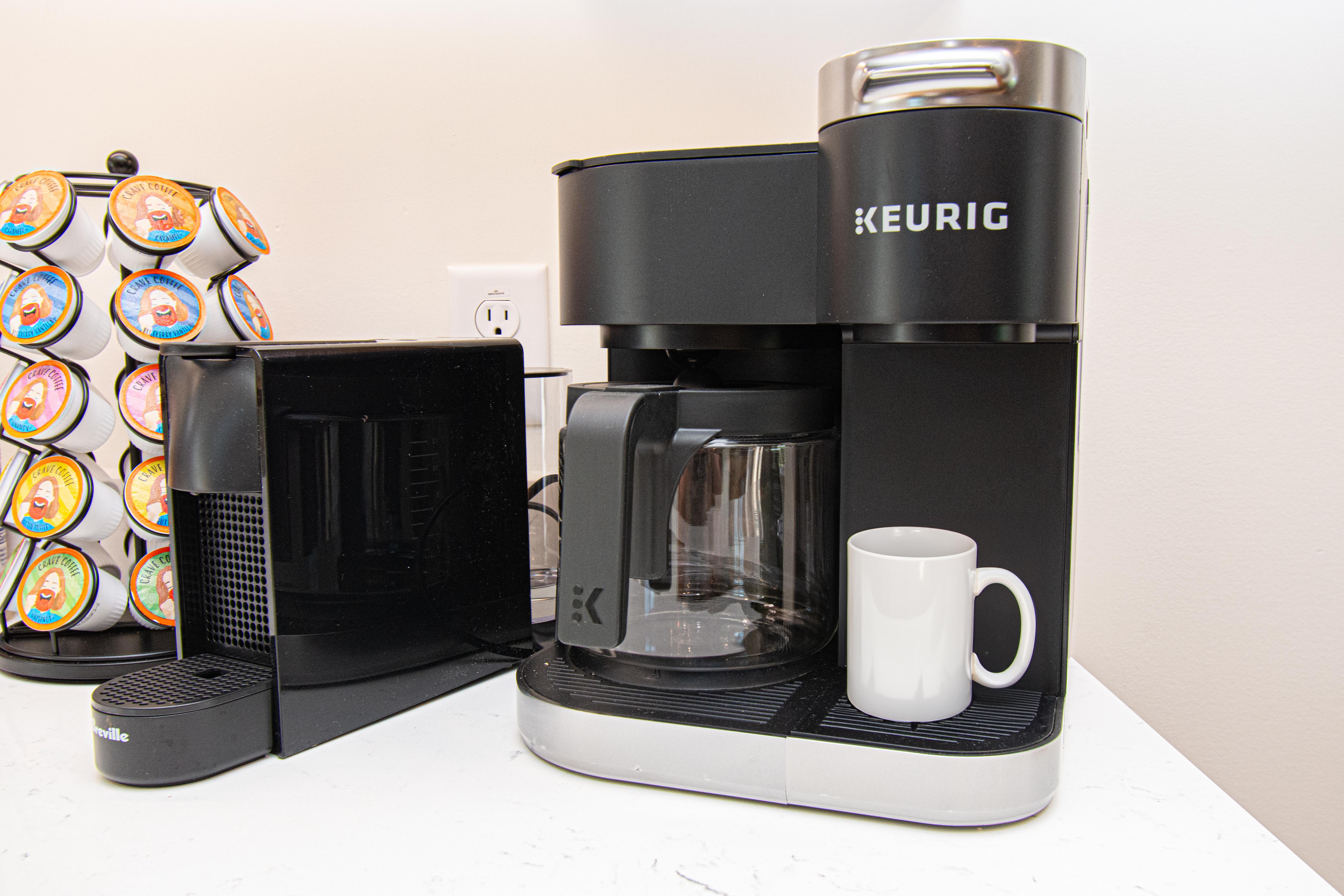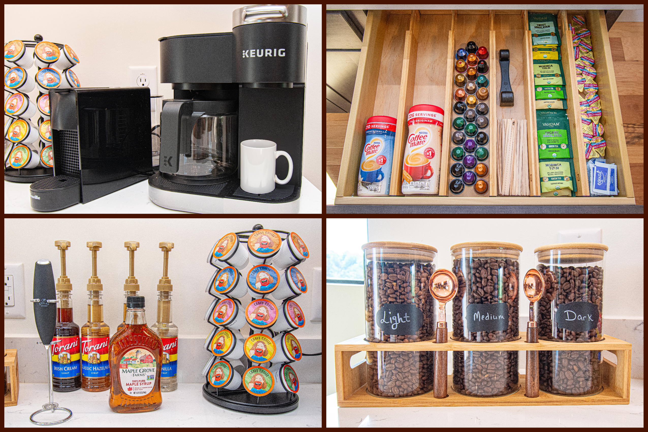 - Coffee Bar with Nespresso, Keurig Single and Pot brew, French Press, Light/Medium/Dark Coffee Beans, Various Syrups, Condiments, sweeteners,