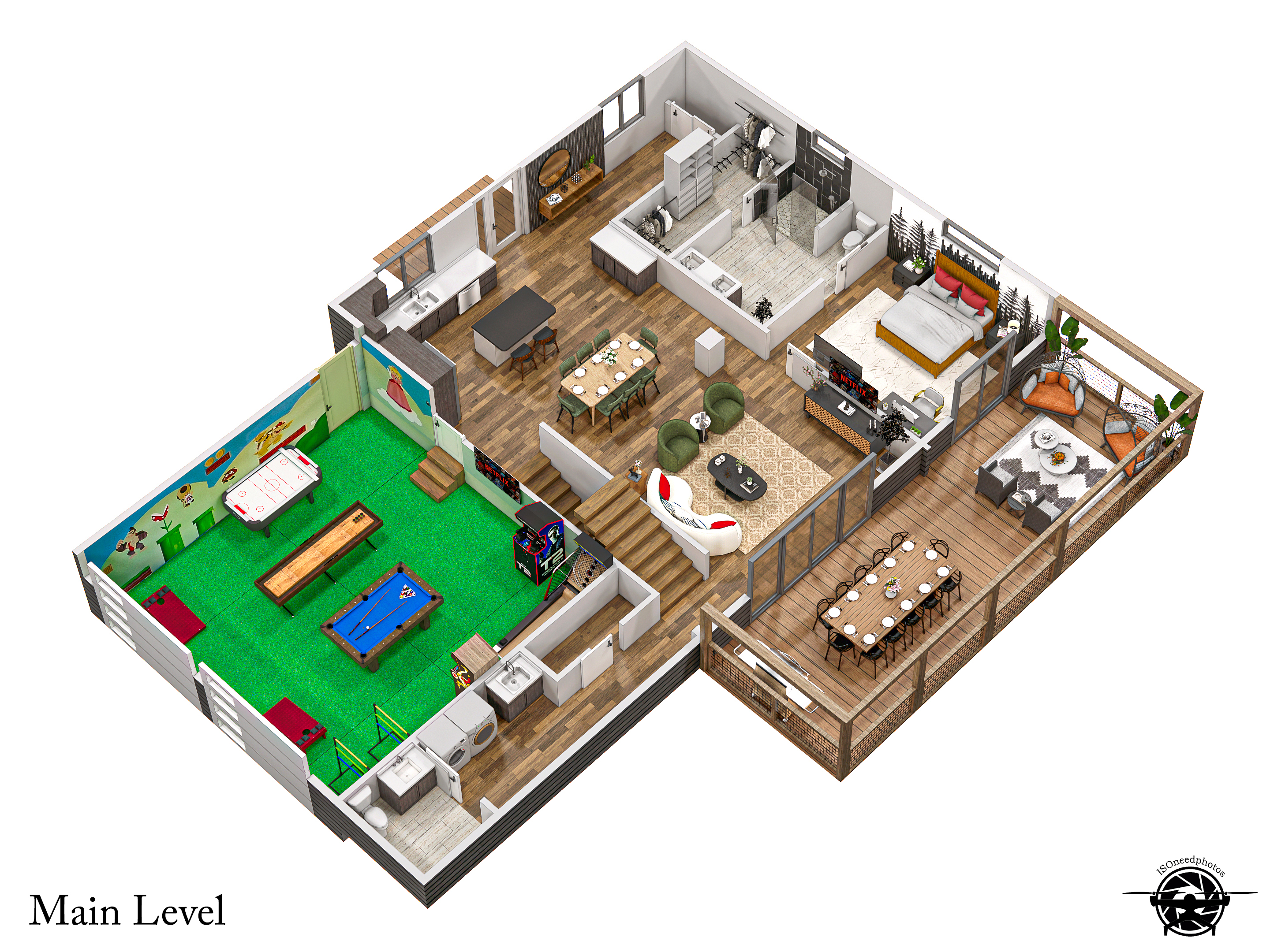 Loaded with entertainment: Pool Table, Air Hockey, Shuffleboard, and Multiple Arcade Games.