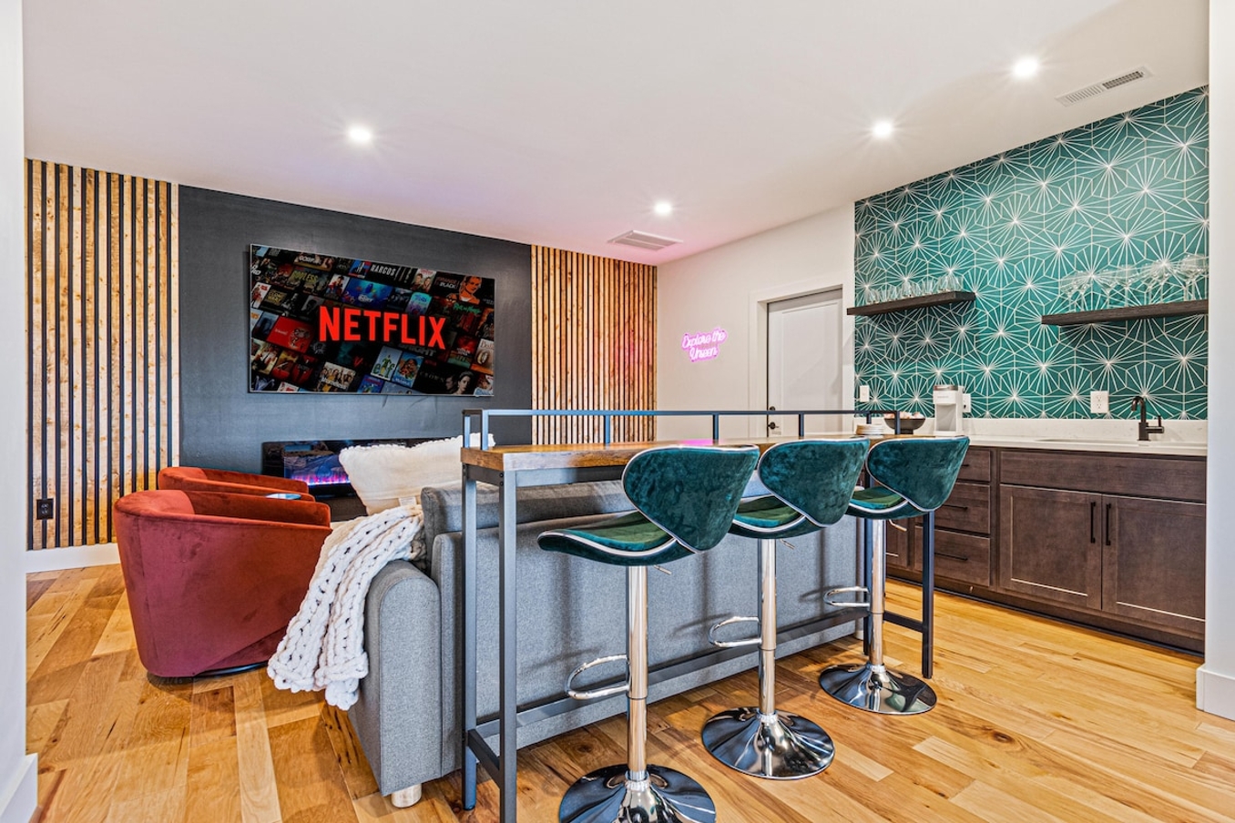 Unwind in the sophisticated space featuring a 65’’ Smart Roku TV for endless entertainment.