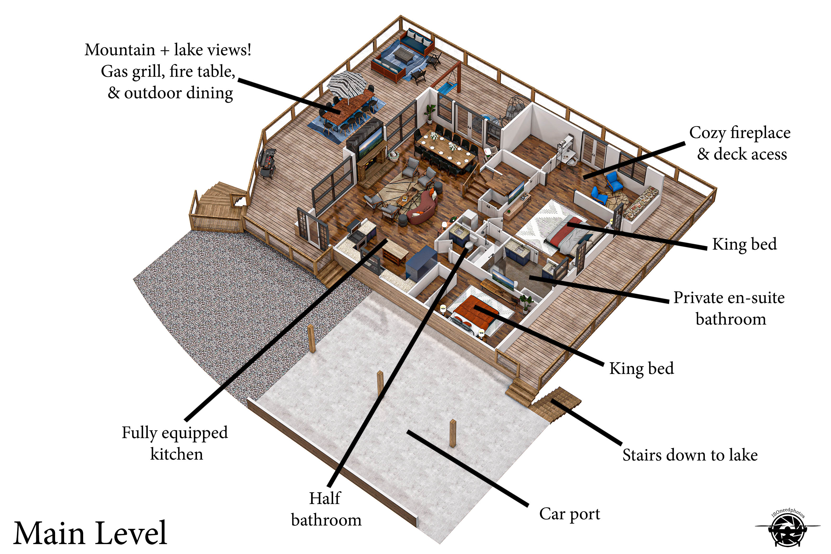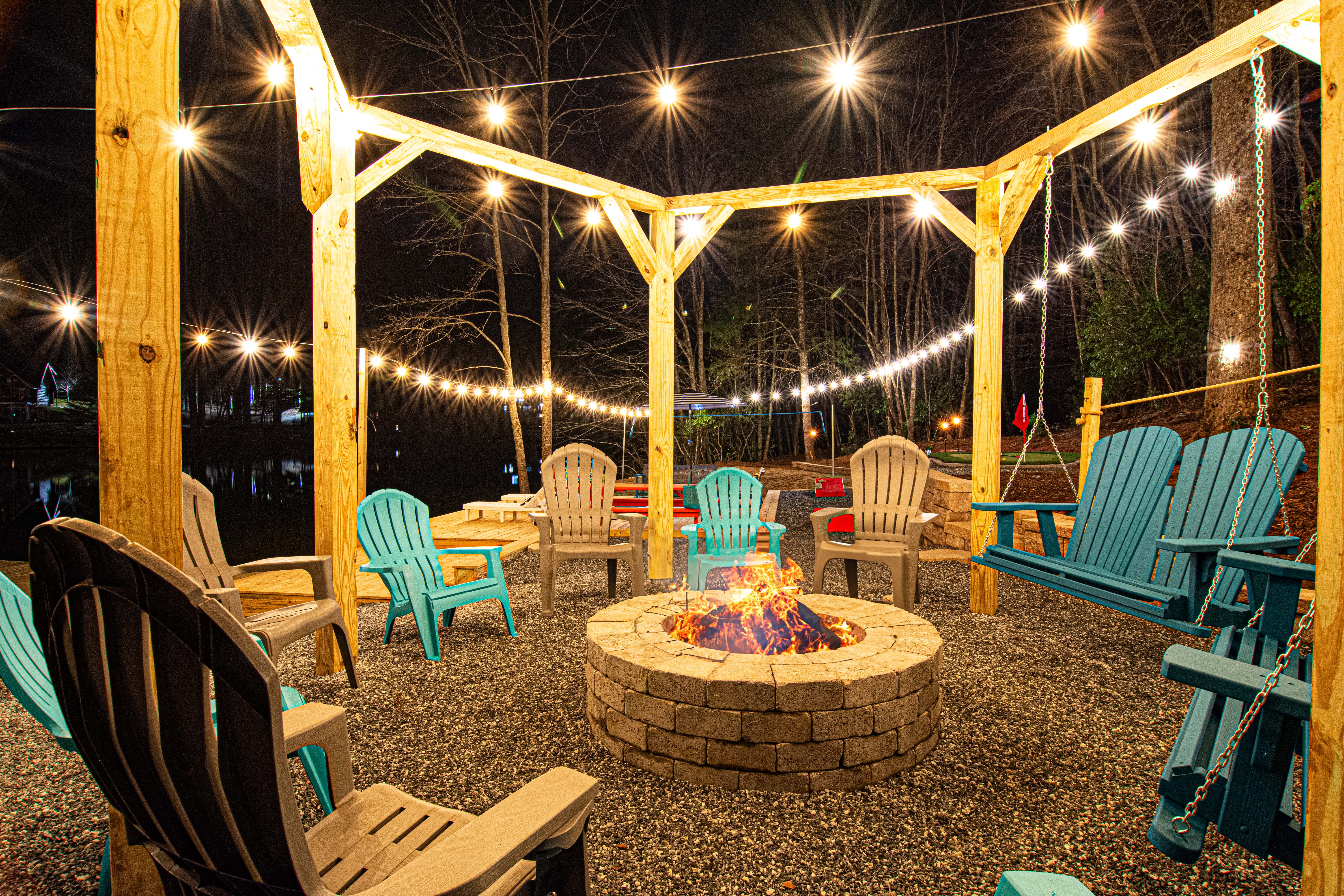 Experience warmth and ambiance with an indoor gas fireplace, plus two outdoor fire pits (one propane on the deck, one wood-burning near the lake).