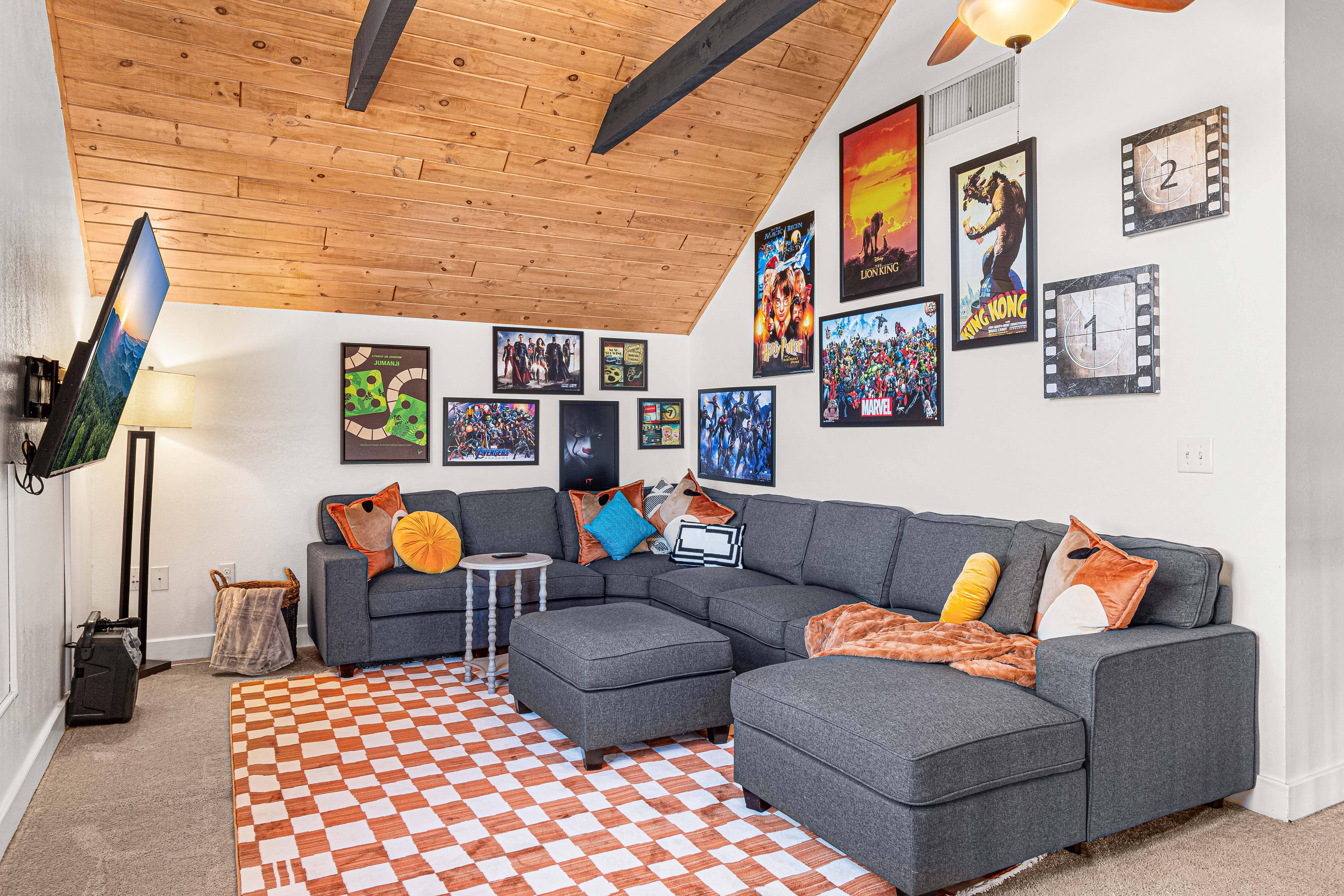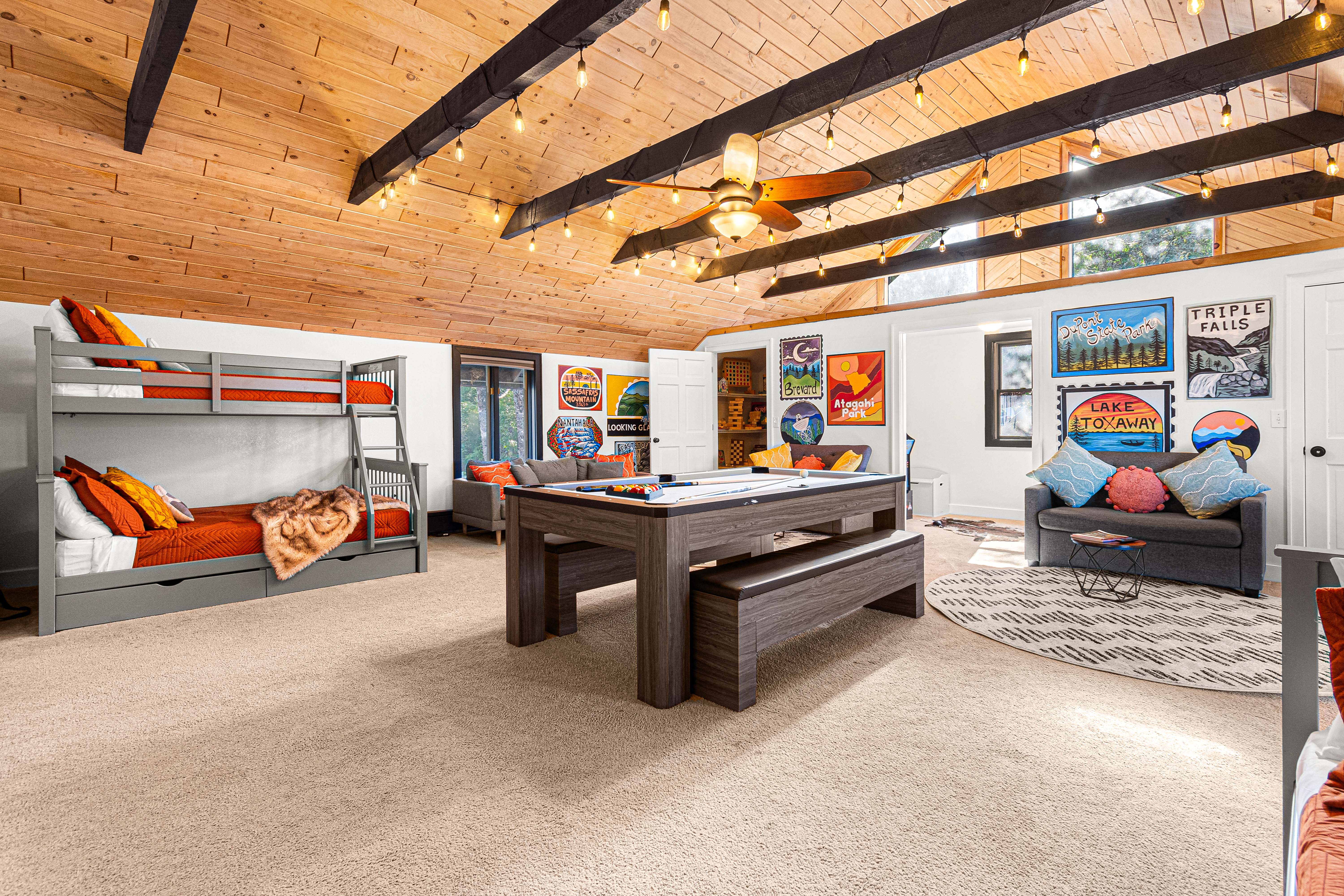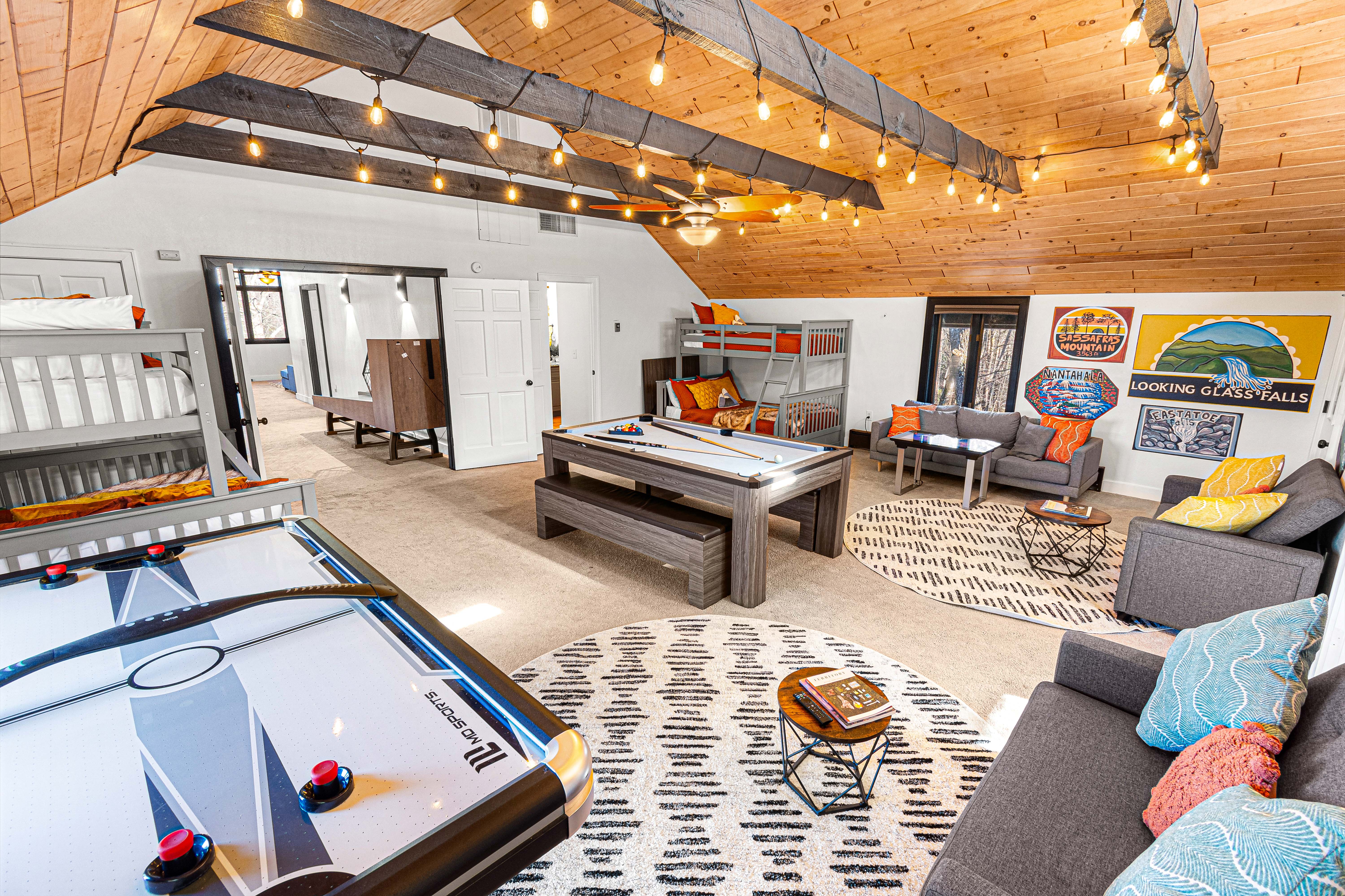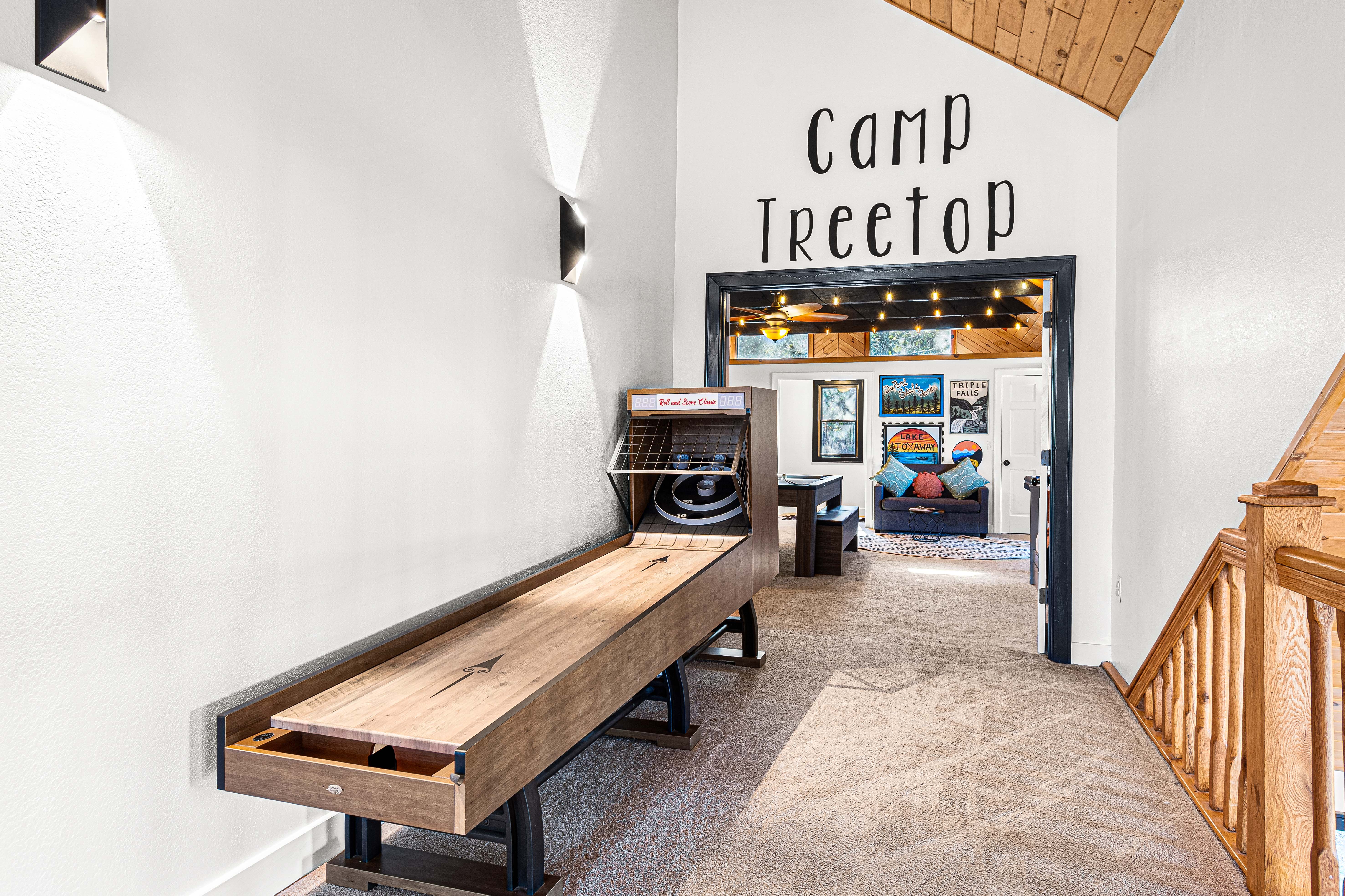 Regardless of the weather, TreeTop LakeHouse offers a range of indoor entertainment options. The "Camp Treetop" room caters to all ages with games like skeeball, air hockey, ping pong, pool, and arcade games. For kids, there's a cozy tent area for play or reading. Enjoy movie marathons on the 75” Smart TV in the loft or rock out with karaoke. 'Camp Treetop' ensures endless fun for all!