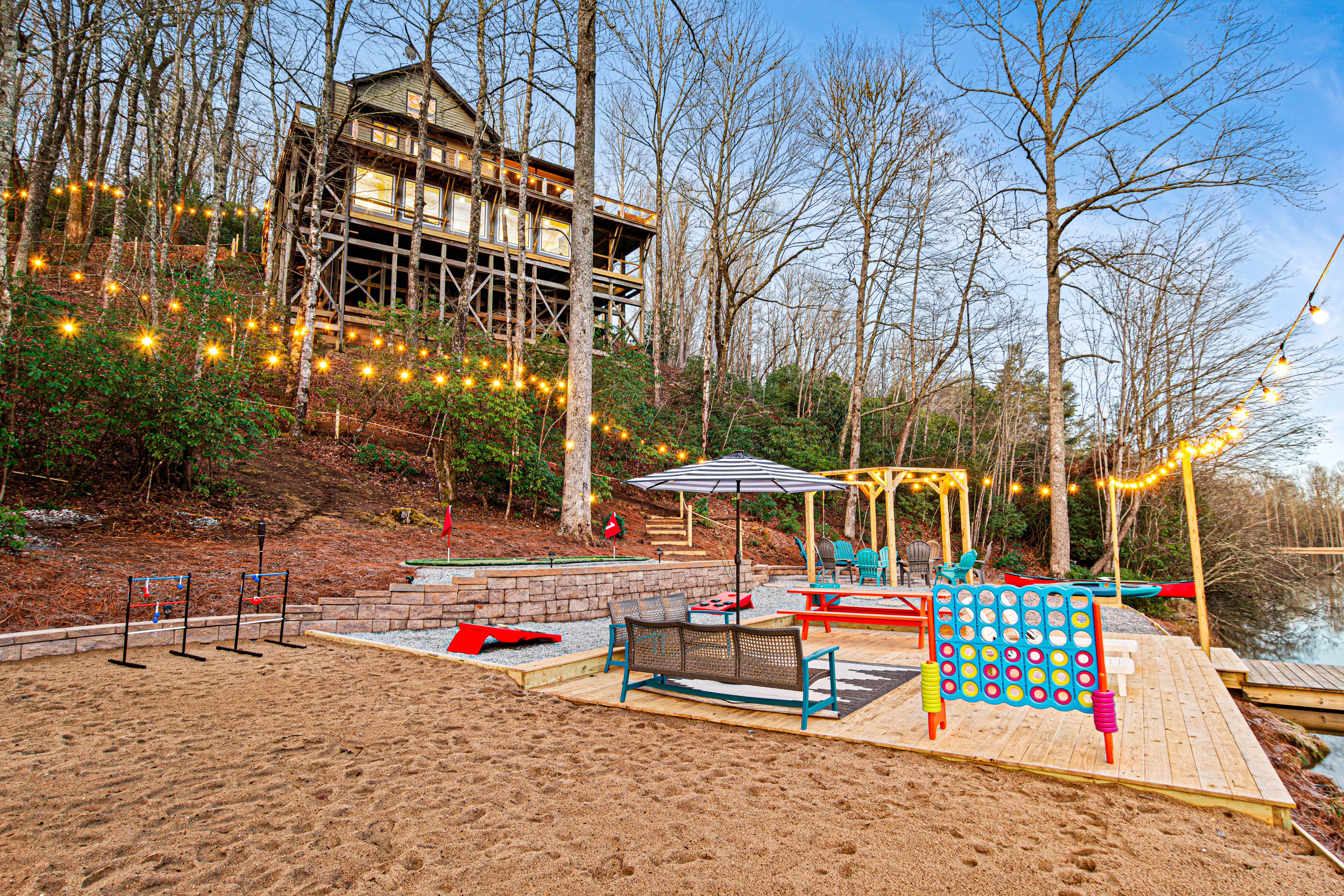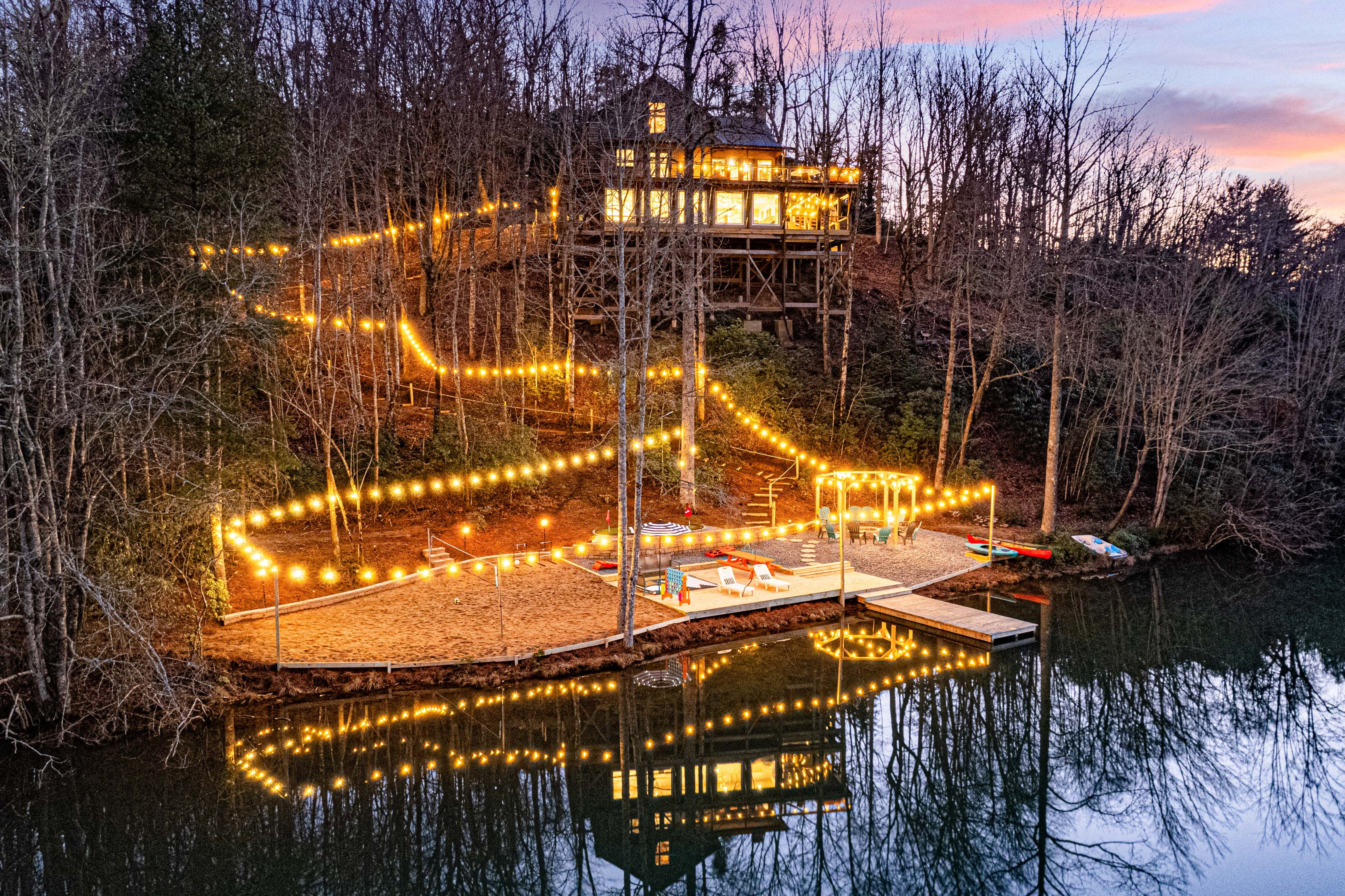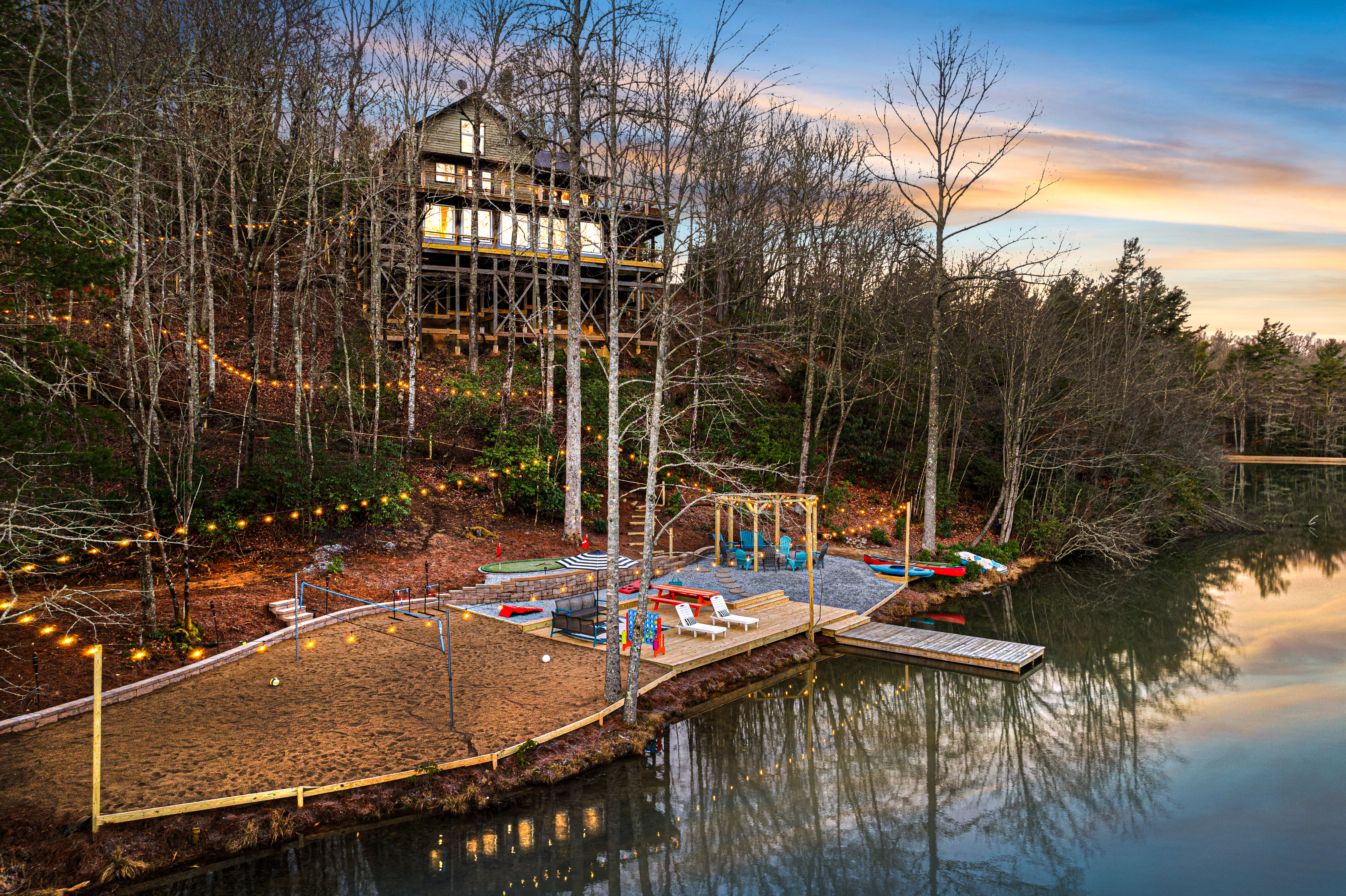 Escape to the tranquility of Treetop LakeHouse, located amidst the majestic Blue Ridge Mountains and 500+ feet of private lakefront to enjoy kayaking, fishing, swimming. Lakefront includes a large firepit, mini-putt, volleyball.