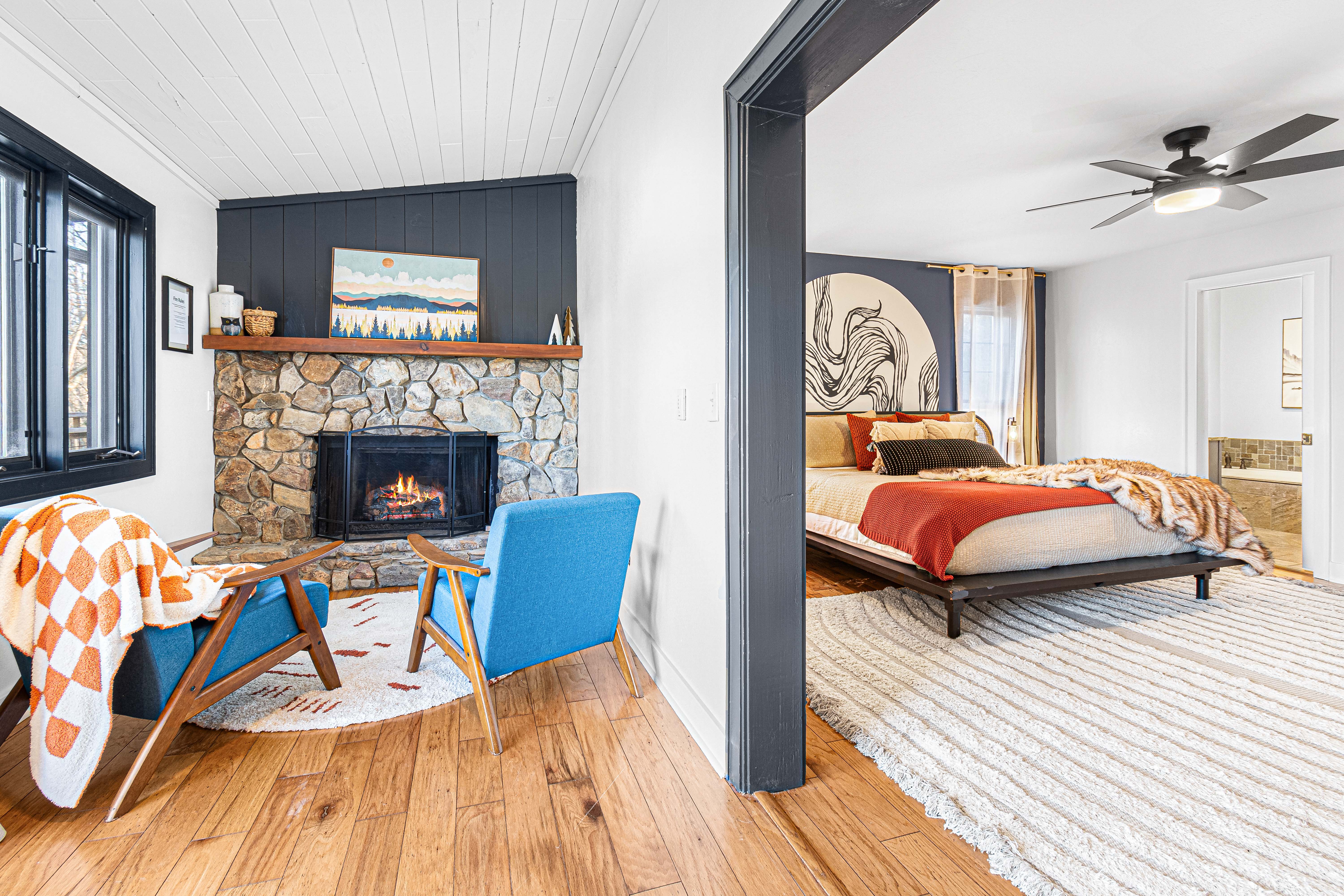 King Bed , with a Side Reading Room featuring a private fireplace , blending coziness with privacy. 65" Smart TV