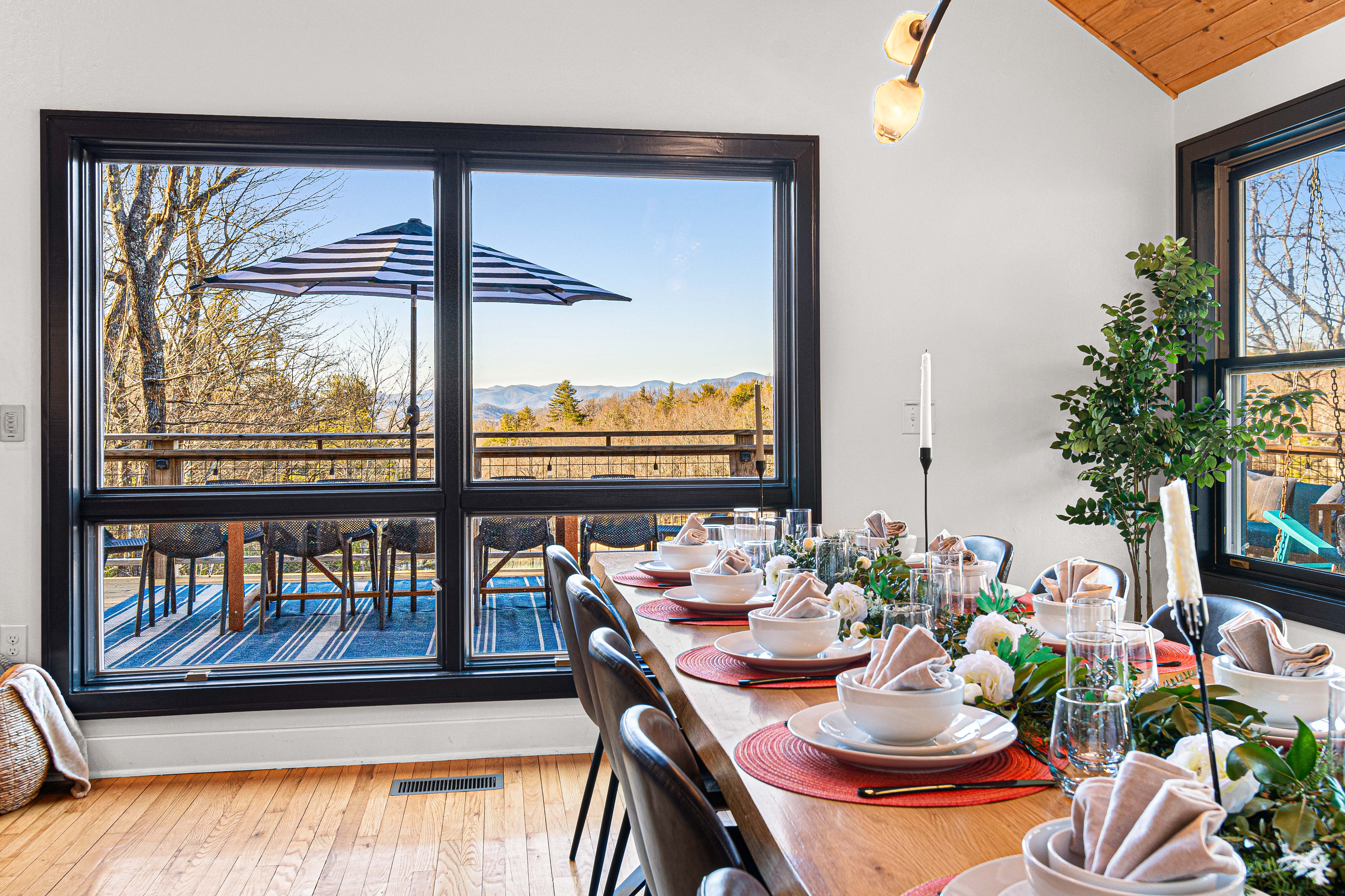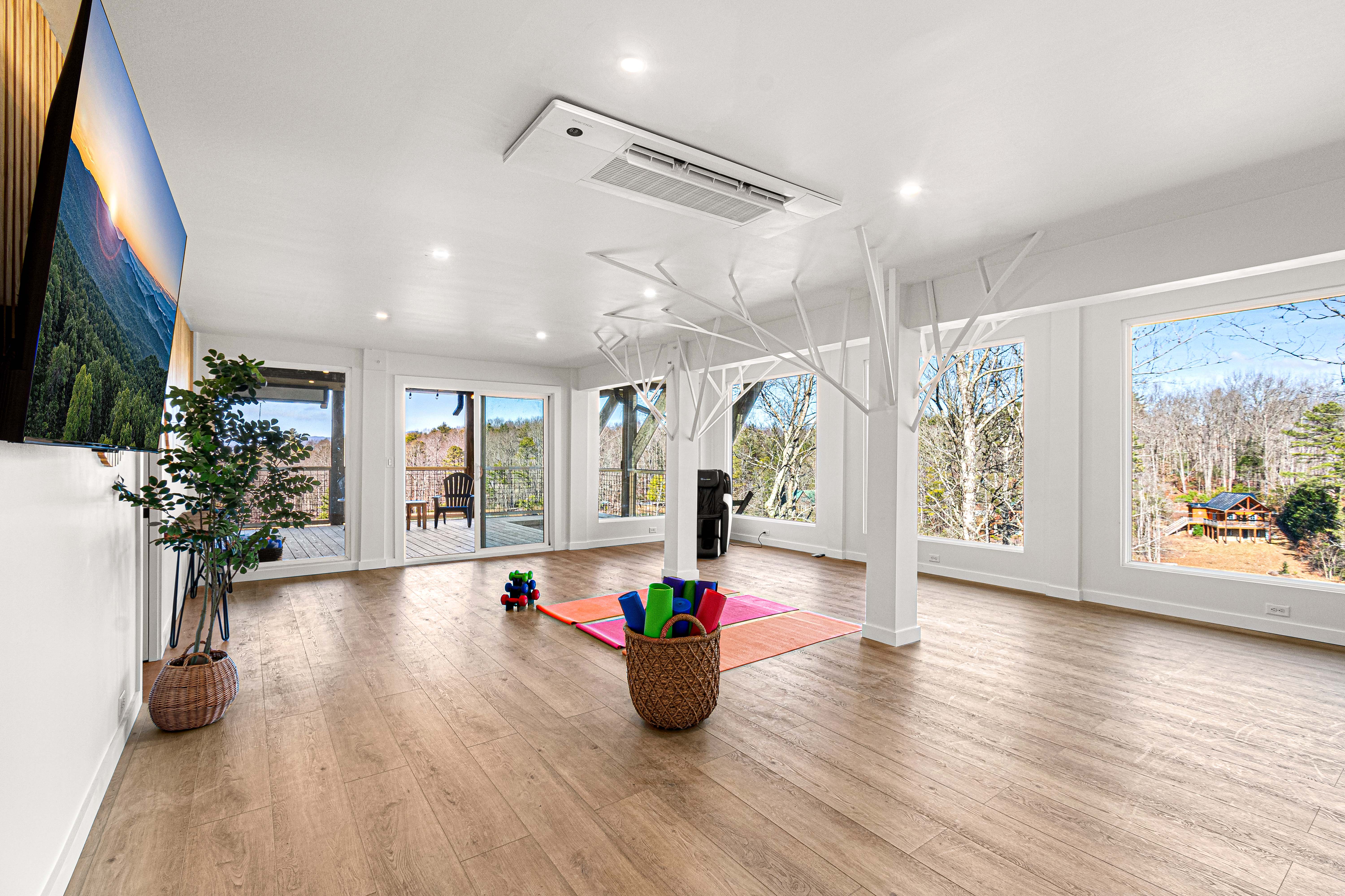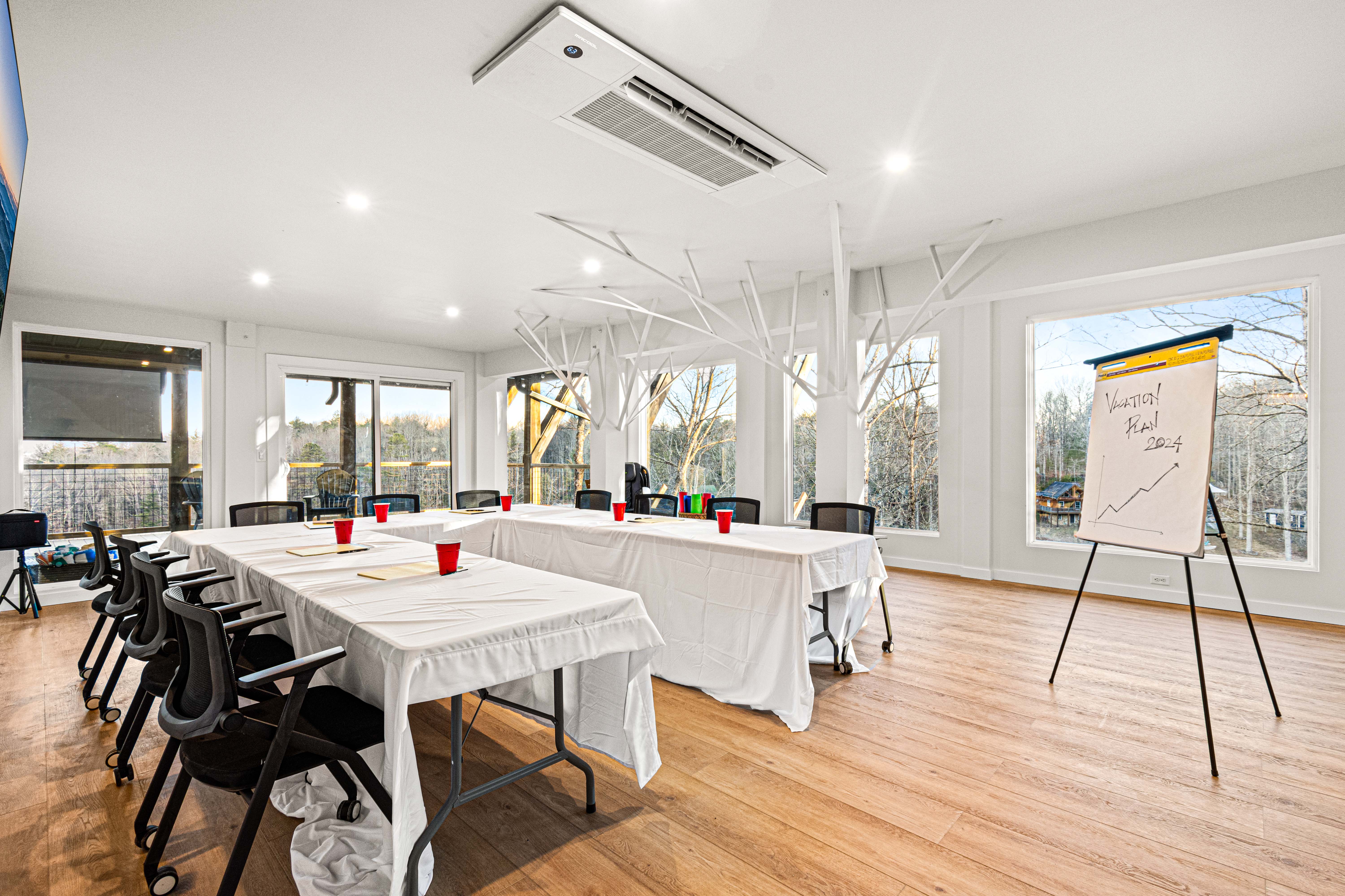 The Flex Space at TreeTop LakeHouse is designed for versatility and convenience, making it ideal for any occasion. From yoga retreats to corporate meetings to game nights, this 700 sq ft area can be easily adapted to meet your needs. With large windows showcasing the beauty of the Blue Ridge Mountains, you will have a stunning backdrop. We provide customizable layouts with 3 large tables and 24 chairs, allowing you to tailor the space for various needs. The Flex Space is more than just a space; it's a blank canvas for your special moments.