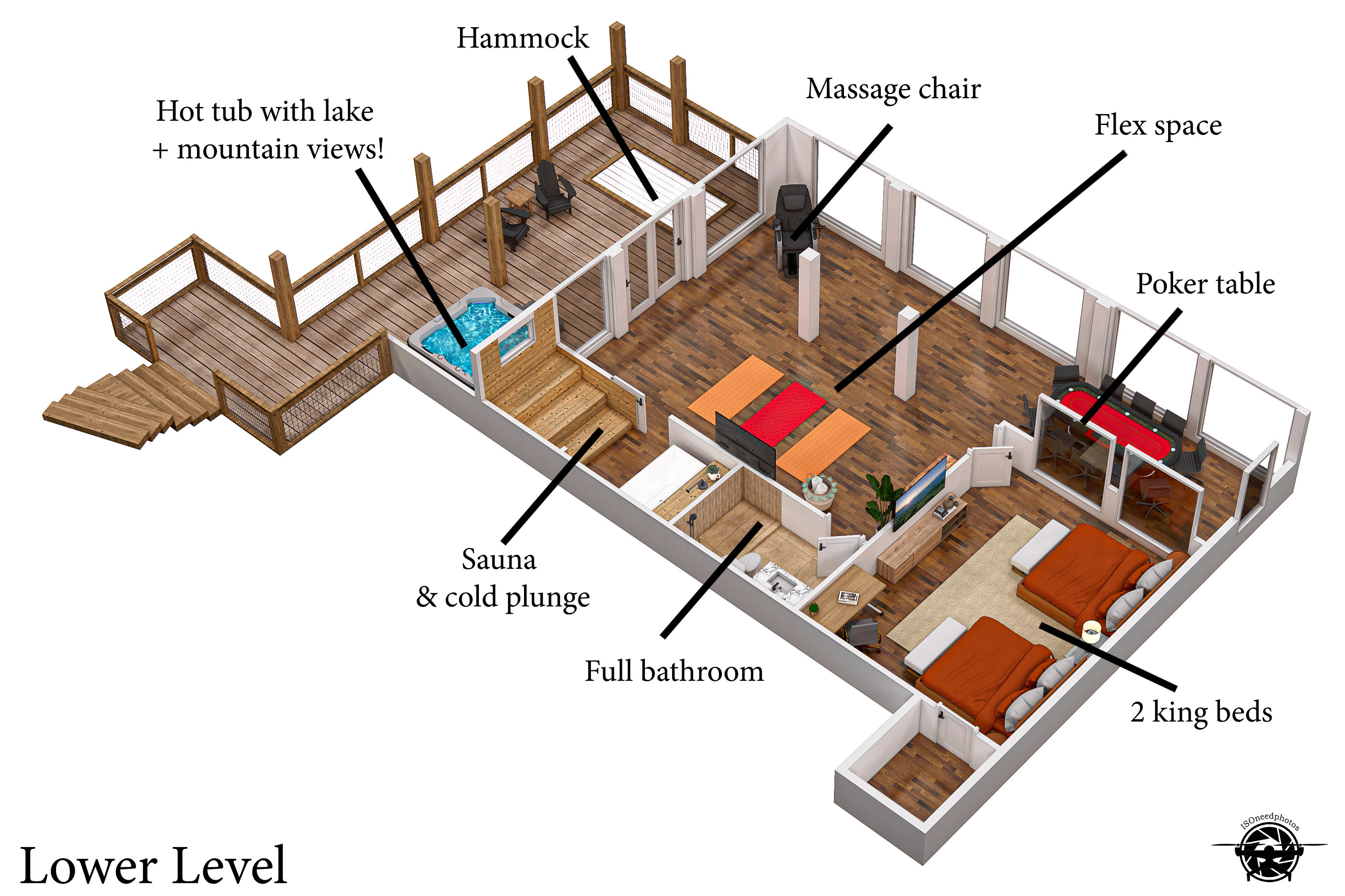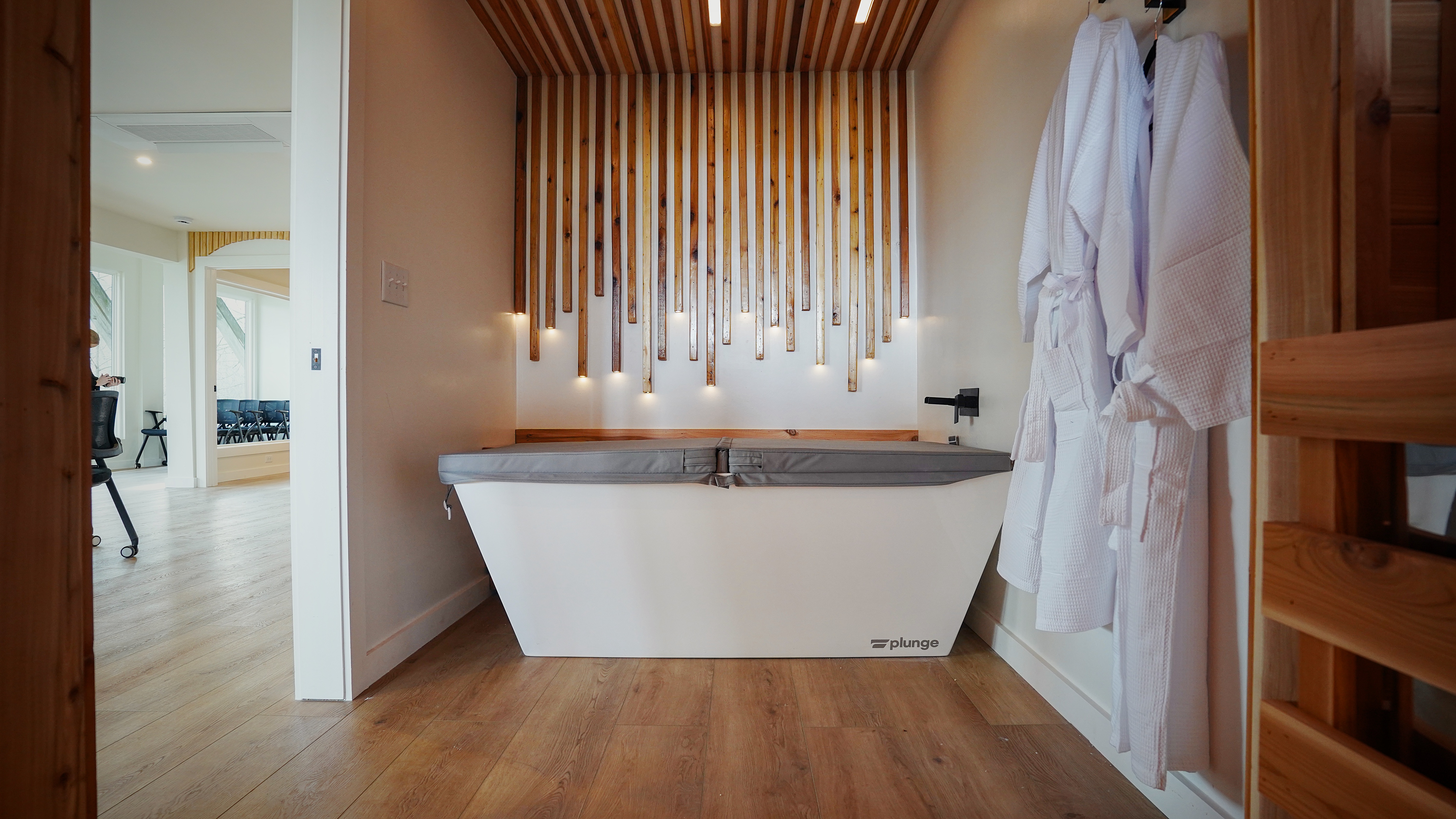 … Ultimate at home spa with large Hot Tub, Sauna, Cold Plunge, Massage Chair, Yoga Studio.