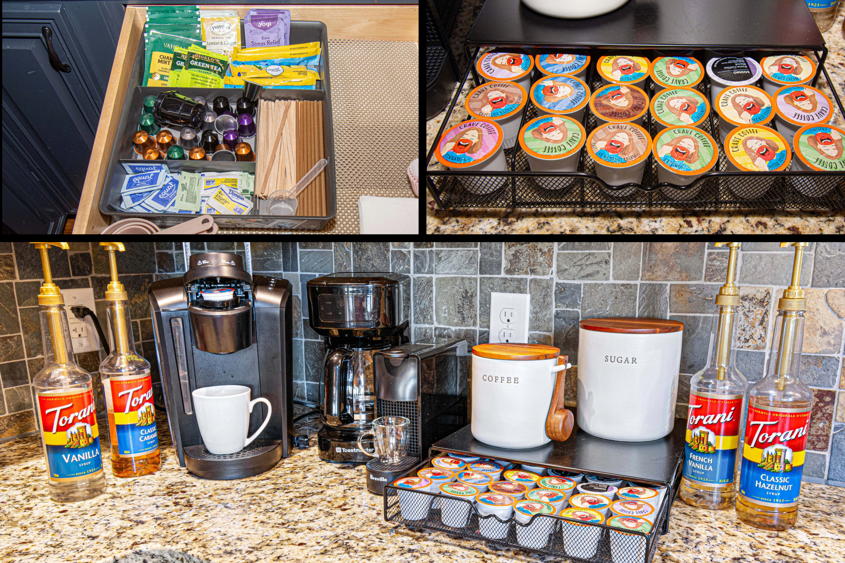 - Coffee Bar with Nespresso, Keurig Single and Pot brew, French Press, Light/Medium/Dark Coffee Beans, Various Syrups, Condiments, sweeteners,