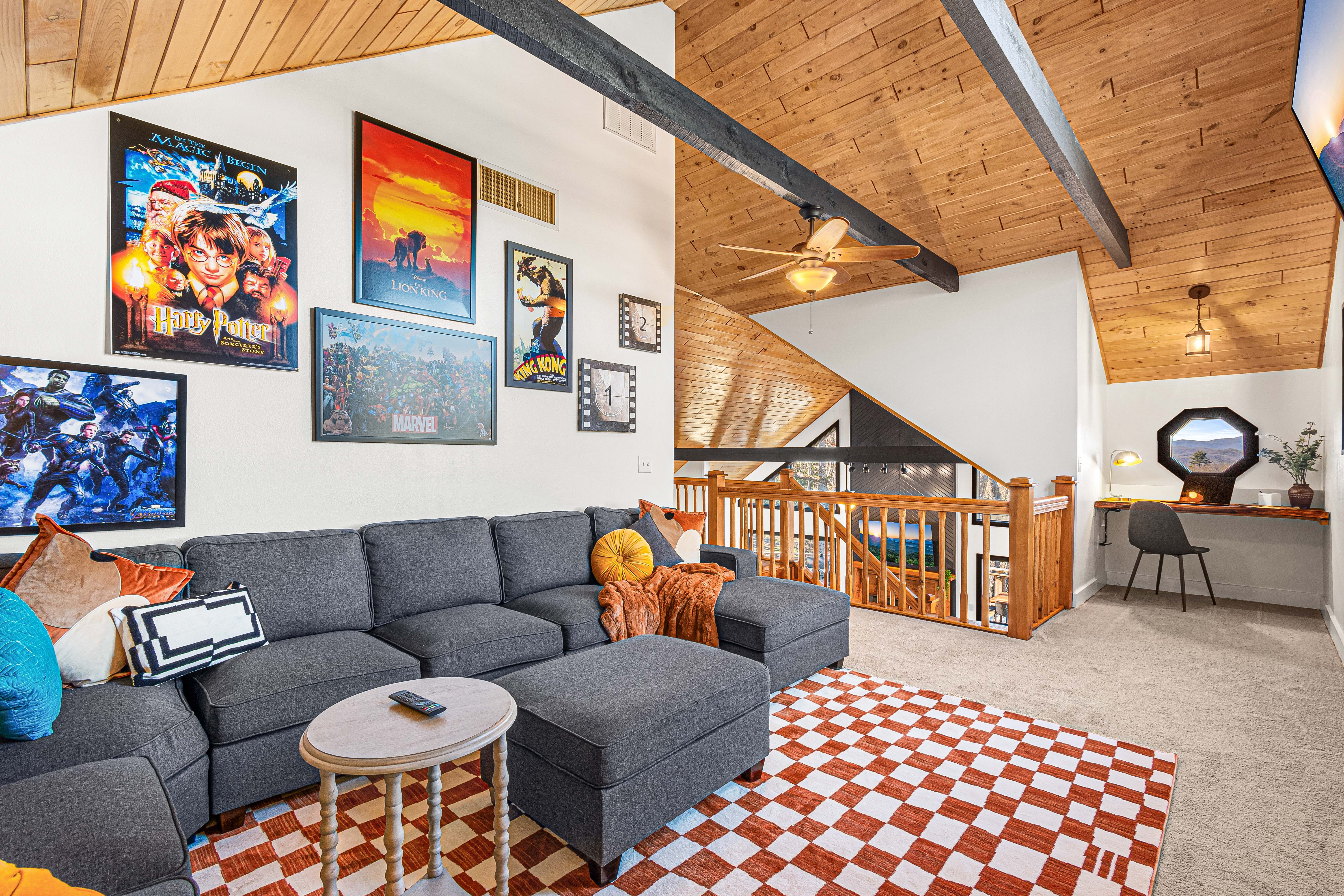 Queen Bed 🛏 upstairs offers a quaint retreat with views. 65" TV