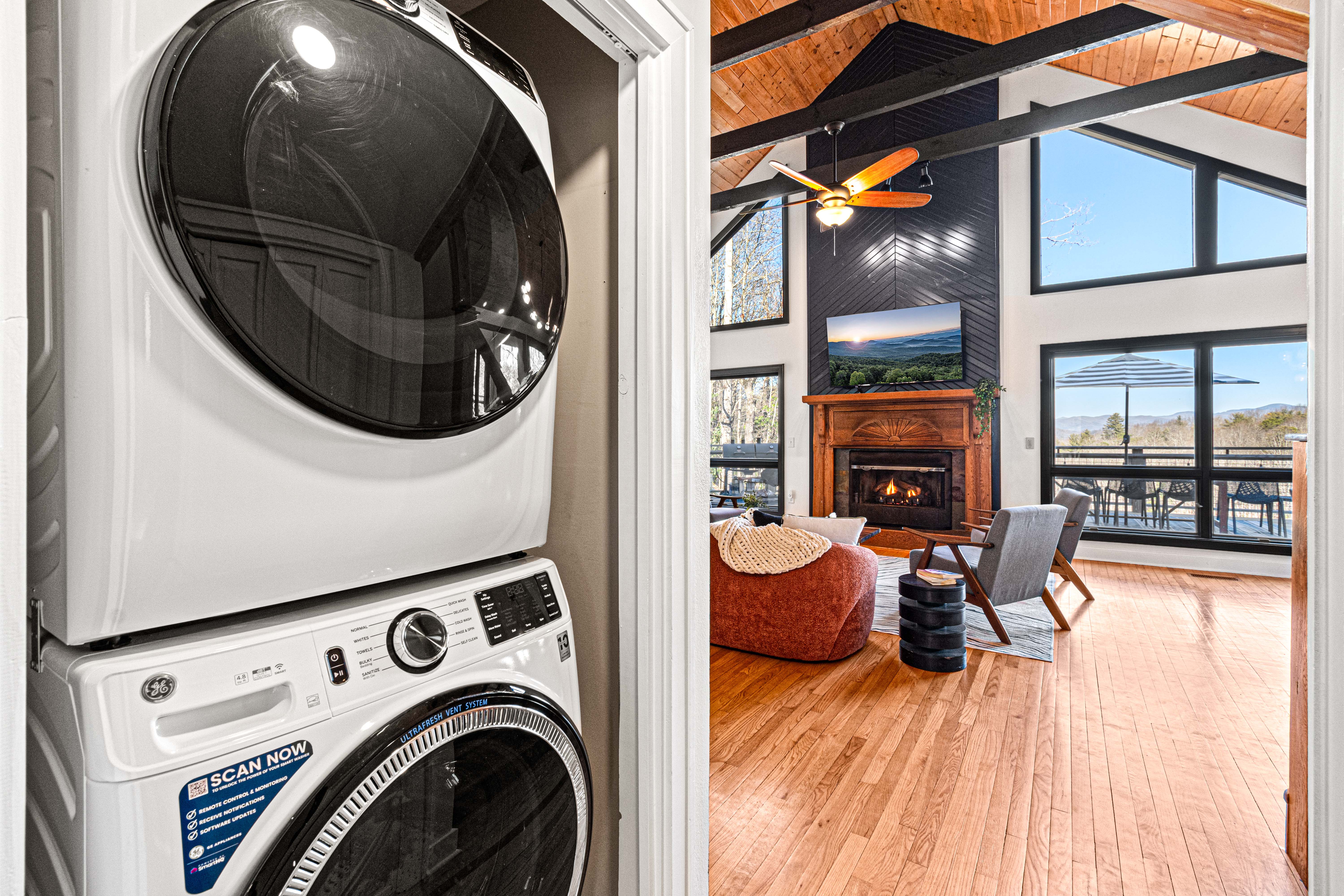 Convenience at its best with a brand new washer and dryer, cleaning supplies, and essentials provided.