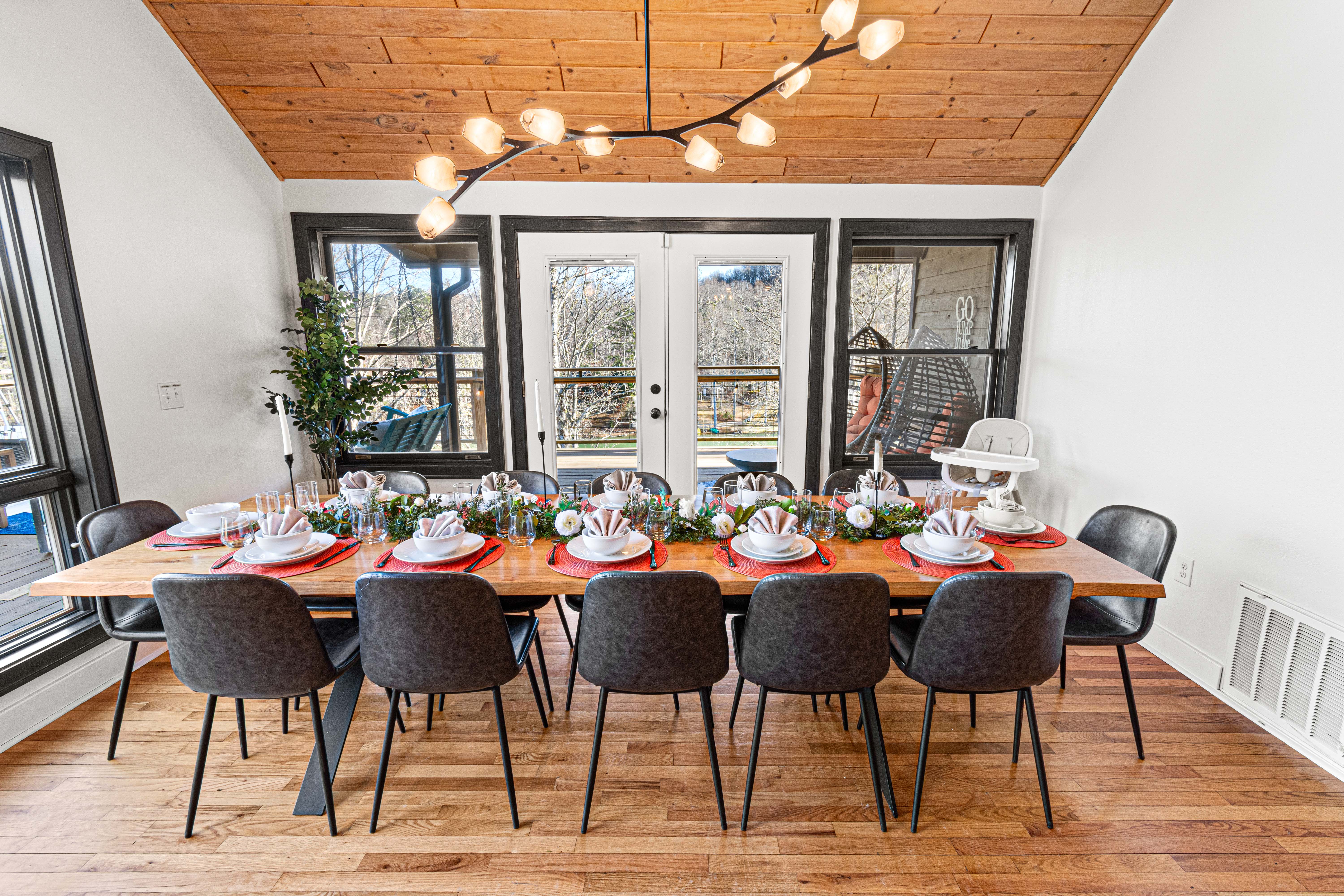The dining area seats 12, with additional kids' dinnerware and a high chair.