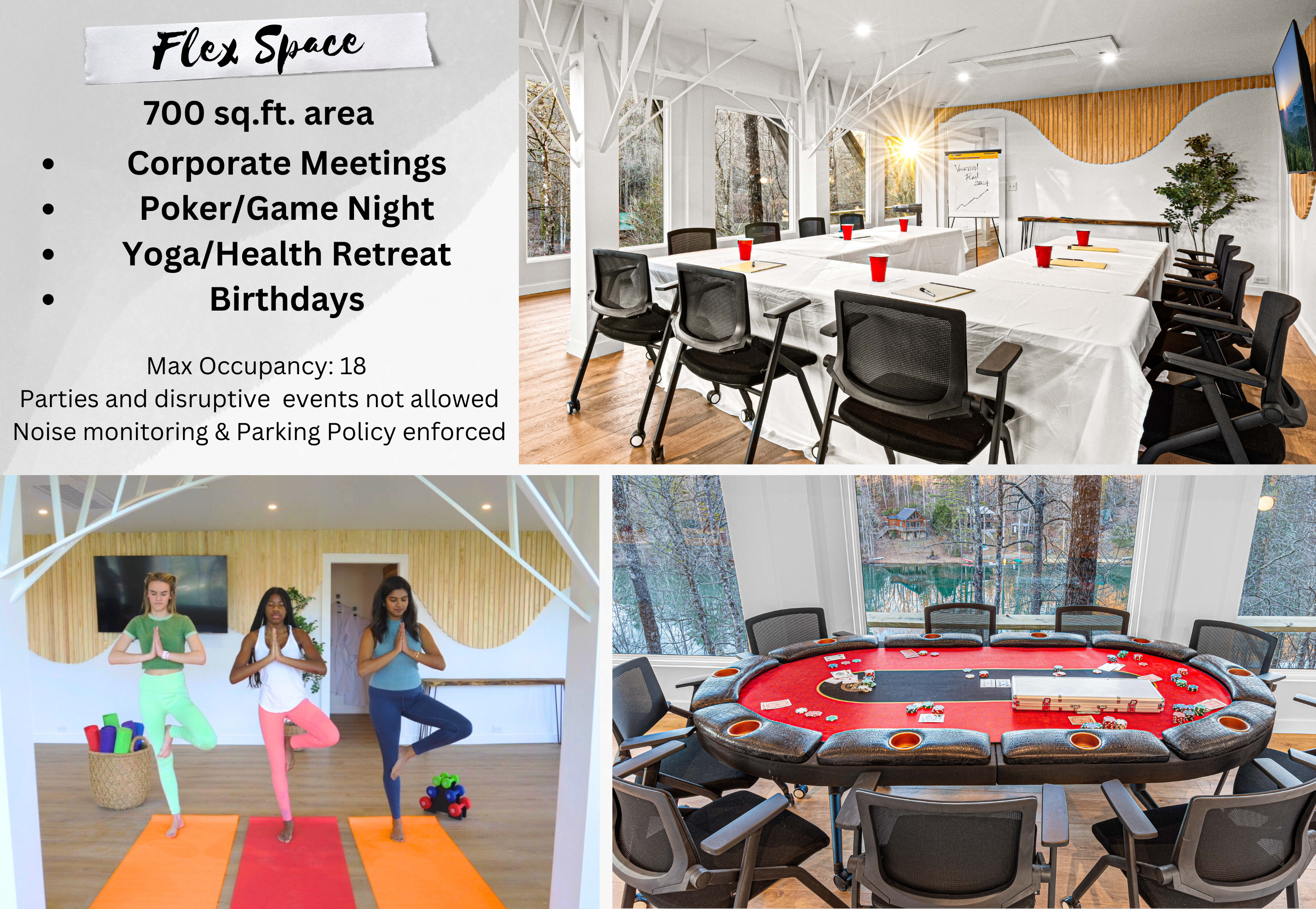 . . . Flex space that can be used for game nights, yoga retreats, meetings, etc. .